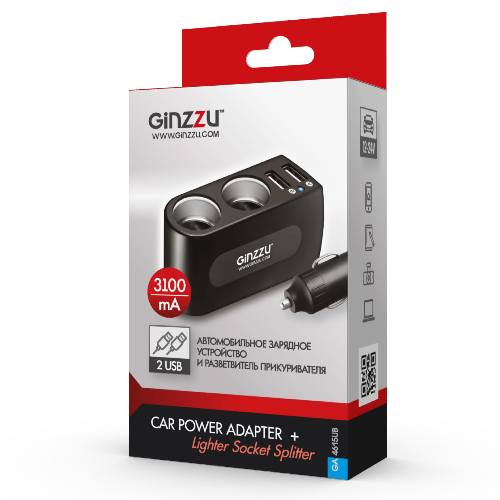 Разветвитель прикуривателя на 2 гнезда + 2хUSB (Ginzzu GA-4815UB) - Разветвитель прикуривателя