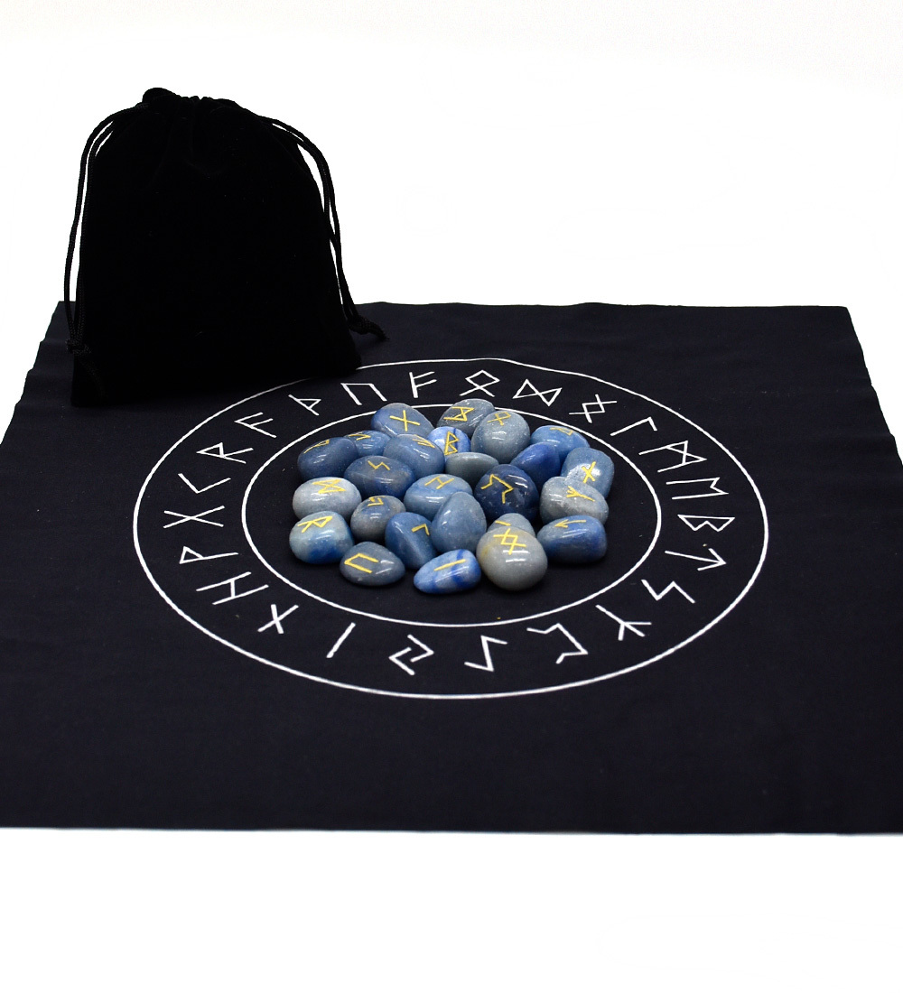 Набор скандинавских рун из голубого авантюрина 25 шт + салфетка и мешочек