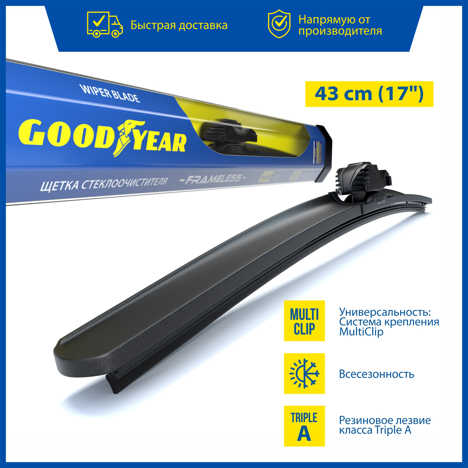 Бескаркасная щетка стеклоочистителя Goodyear FRAMELESS 17"/43 cm всесезонная, MULTICLIP