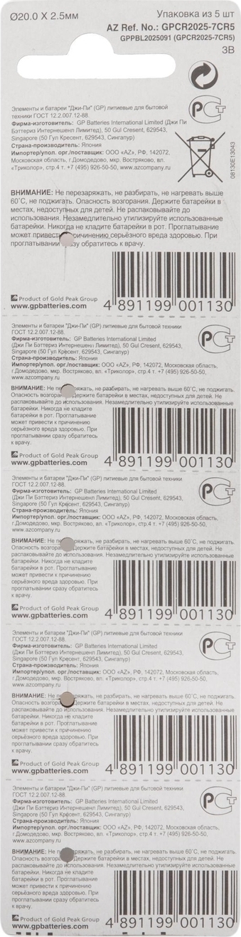 Батарейки литиевые GP Lithium, тип CR2025, 3V, 5шт.