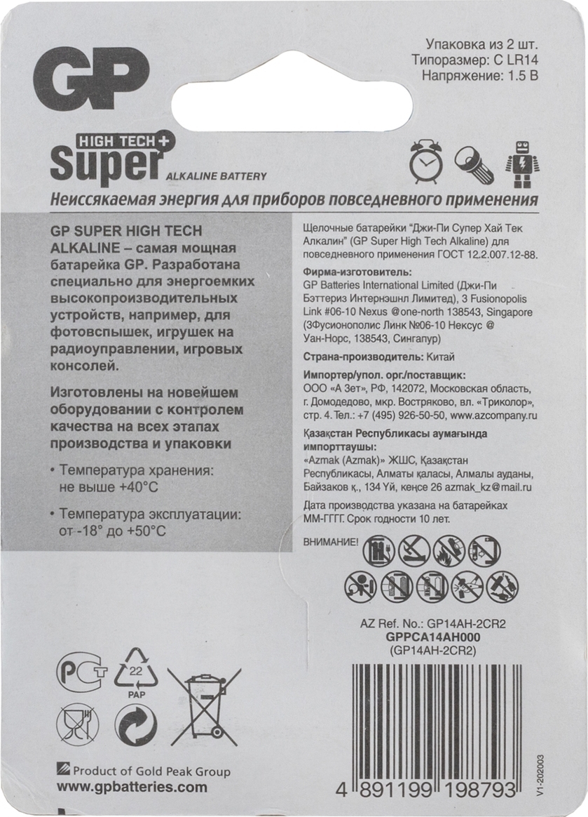 Батарейки щелочные (алкалиновые) GP Super High Tech, тип C, 1.5V, 2шт. (LR14)