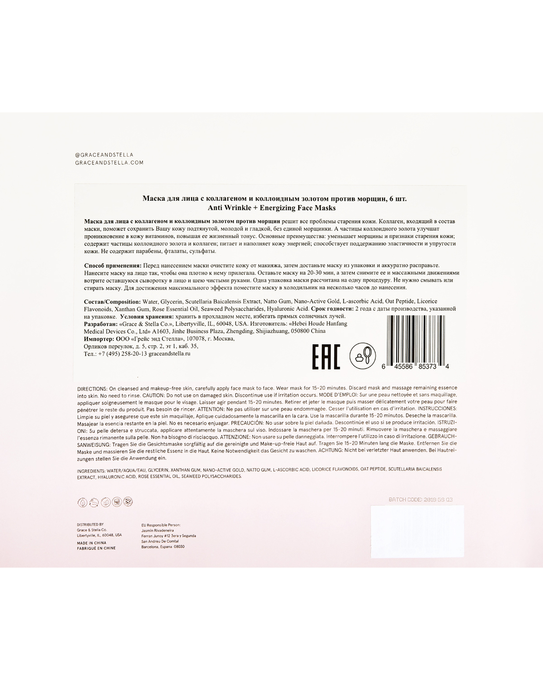 Grace and Stella Гидрогелевая маска для лица с коллагеном и золотом. Набор - 6шт