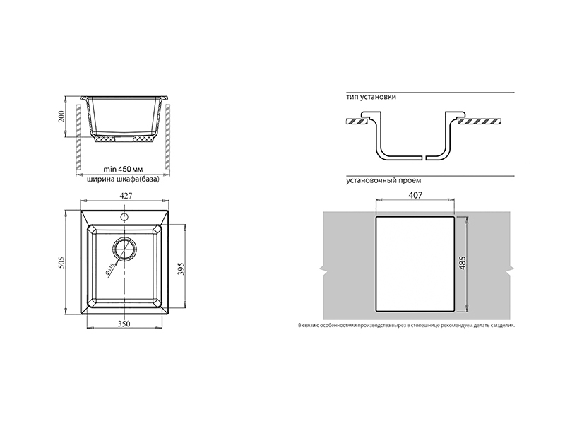 Каменная мойка для кухни врезная GranFest GF-P505, цвет черный, 430х505х200 мм / раковина для кухни