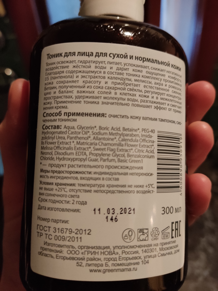 Green mama ТОНИК ДЛЯ ЛИЦА ДЛЯ СУХОЙ И НОРМАЛЬНОЙ КОЖИ 300 МЛ