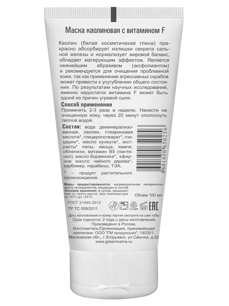 Green Mama Маска каолиновая, с витамином F, для проблемной кожи, 100 мл