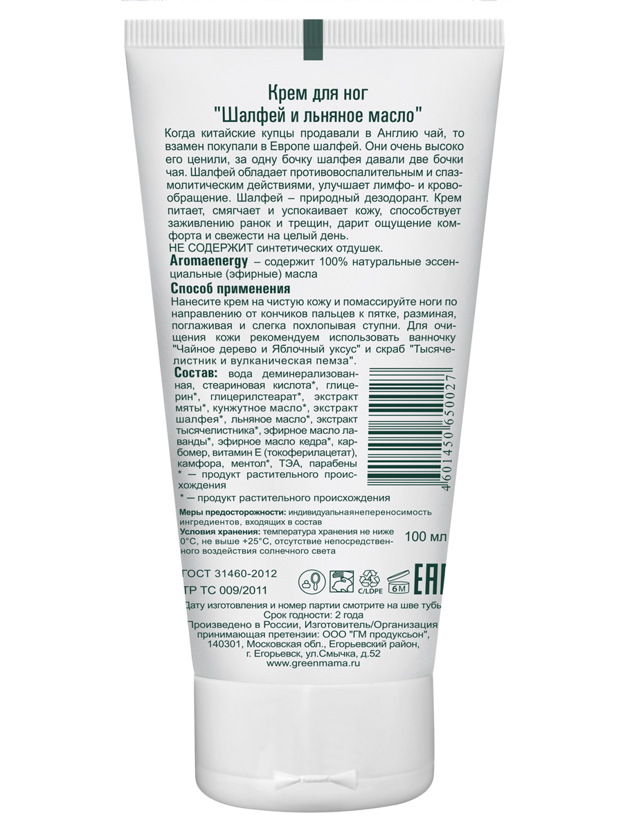 Green Mama Крем для ног "Шалфей и Льняное масло", 100 мл
