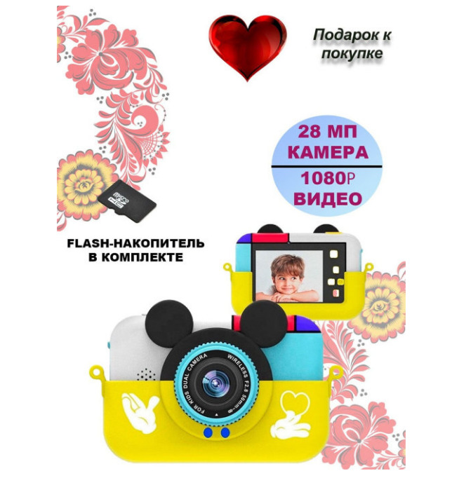 Детская цифровая фотокамера Mickey Mouse с ударопрочным чехлом + microSD/Адаптер 8 Gb