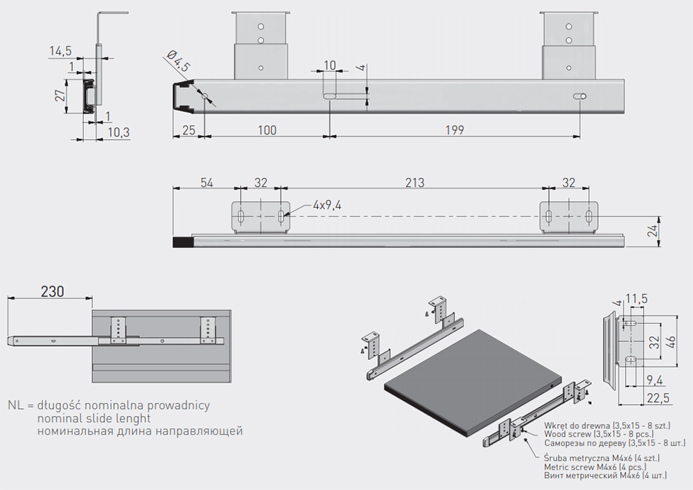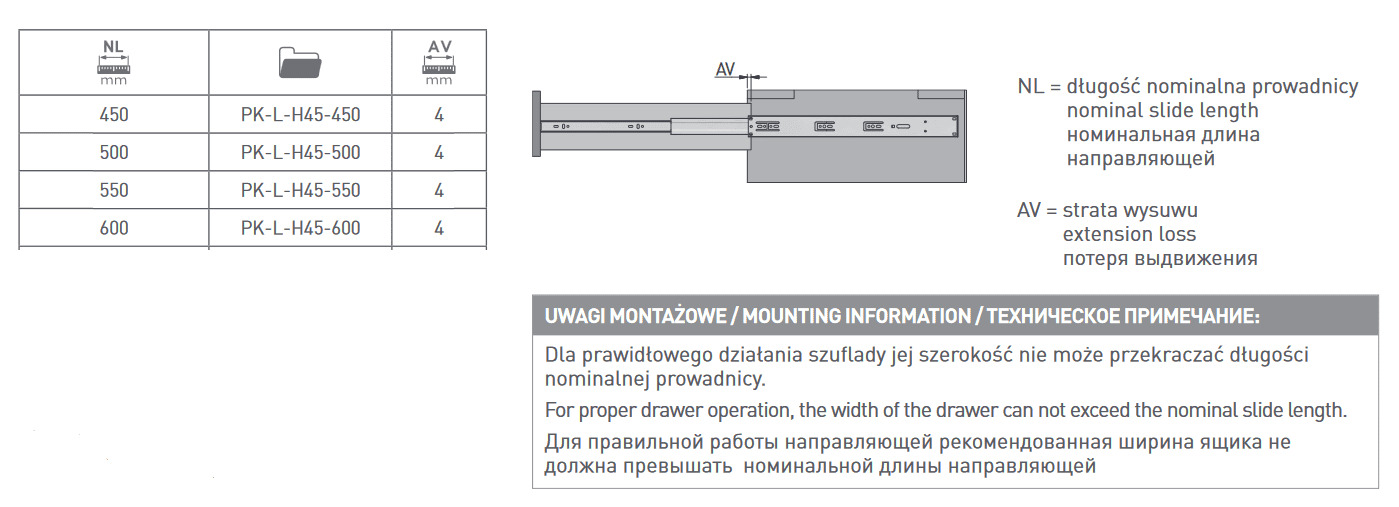 Направляющие шариковые, GTV Versalite PLUS, PK-L-H45-550 с ДОВОДЧИКОМ полного выдвижения