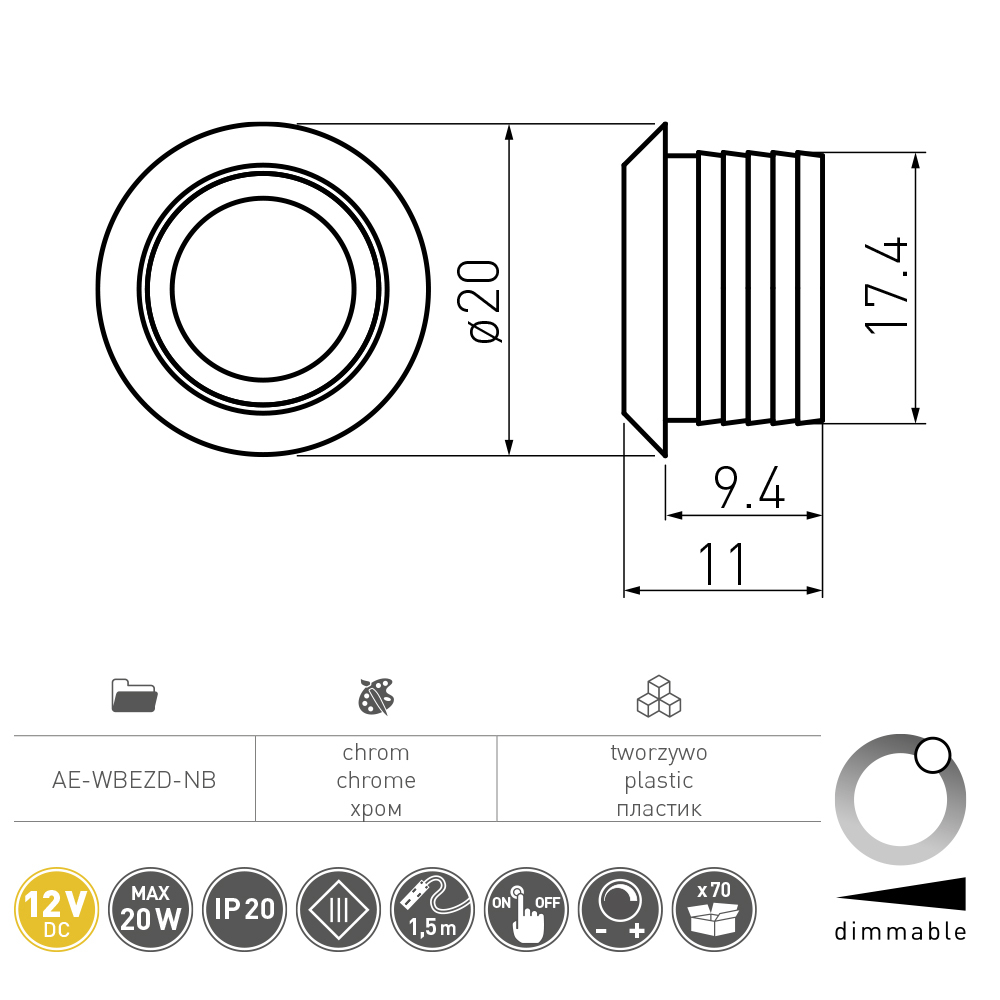 Выключатель сенсорный с регулировкой яркости 12V, постоянного тока, max 20W, кабель 1,5м