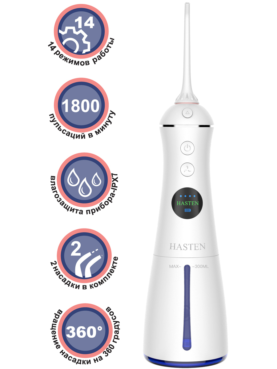 HASTEN ирригатор полости рта - HAS845 (14 уровней мощности, емкость 300мл., OLED-дисплей)