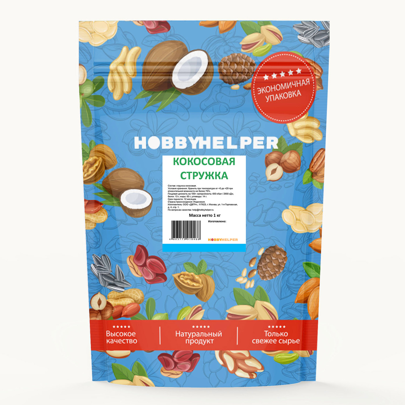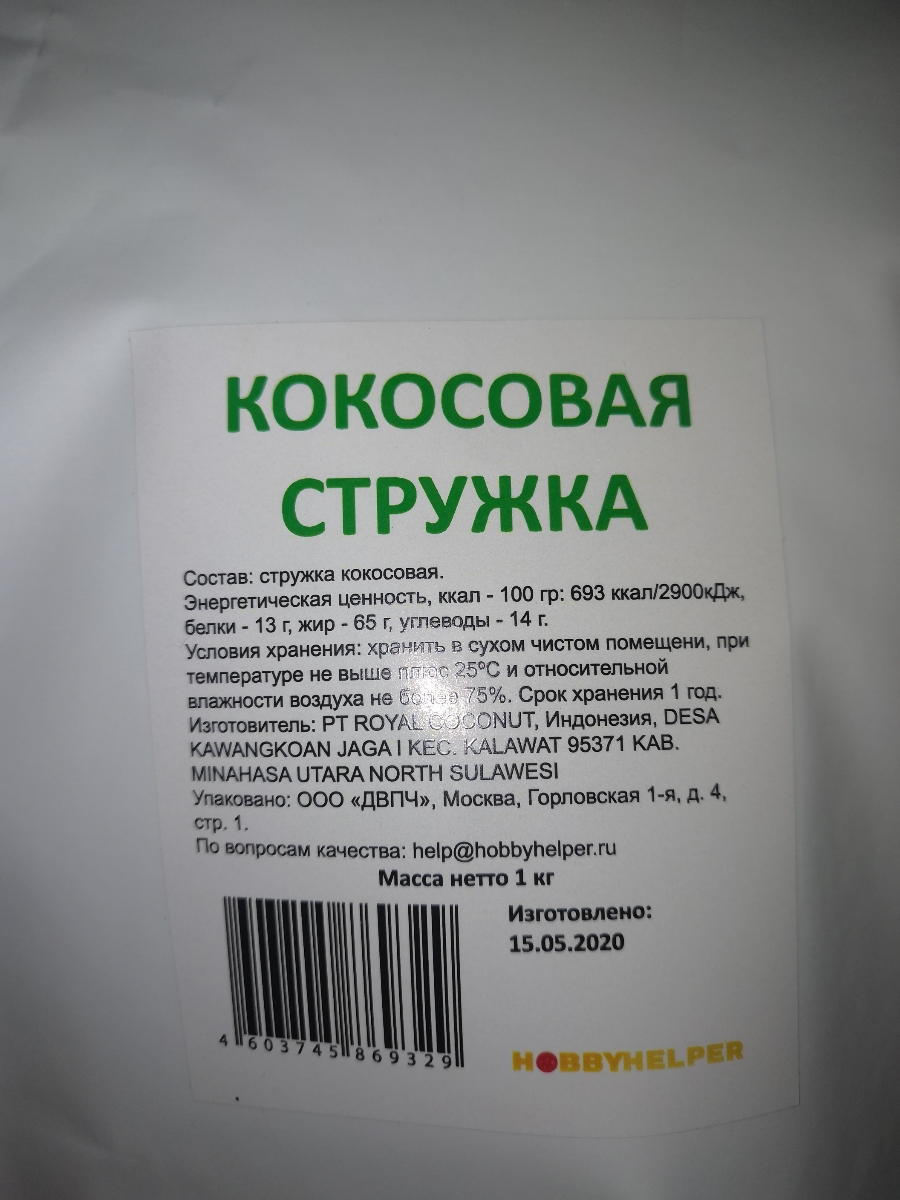 Кокосовая стружка HOBBYHELPER фракция 2-5мм, 1 кг