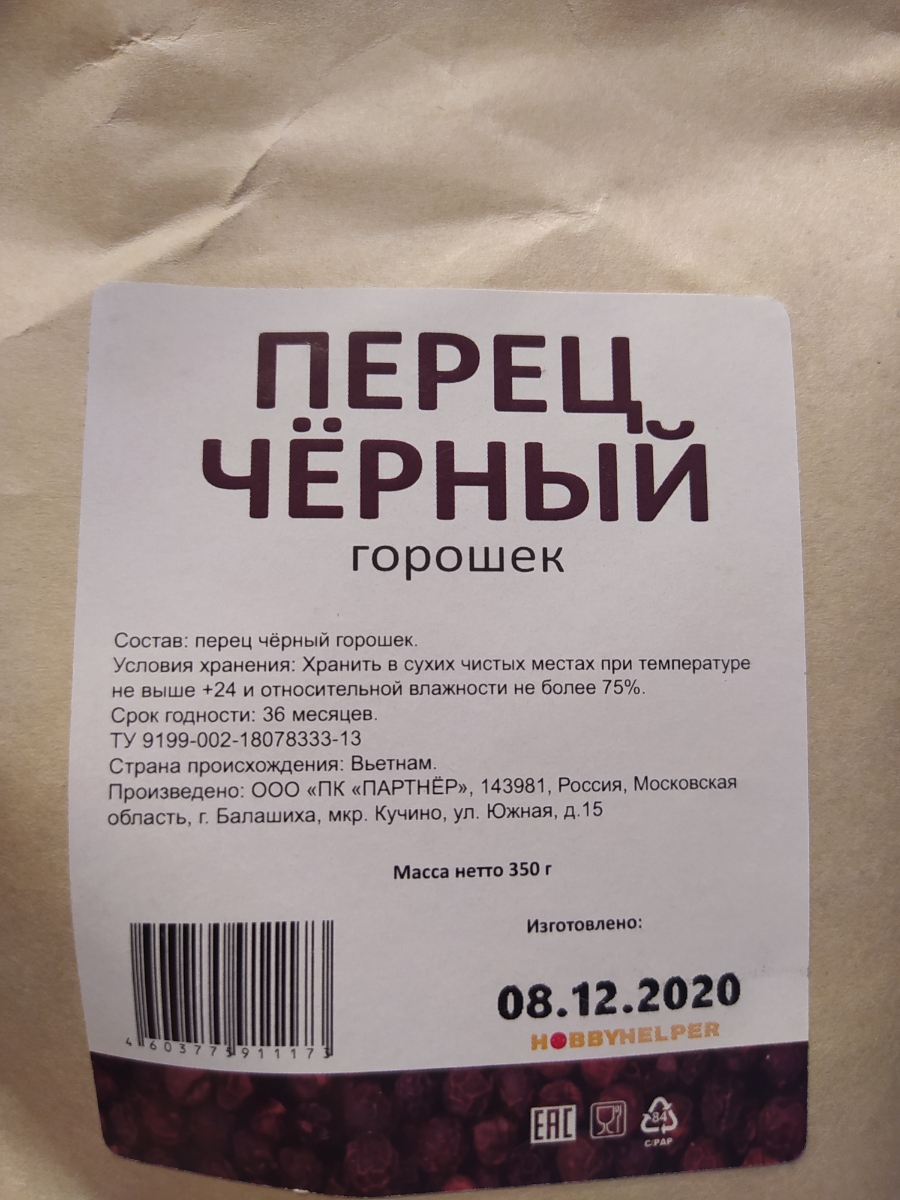 Перец HOBBYHELPER чёрный горошек 550 г/л (350г)
