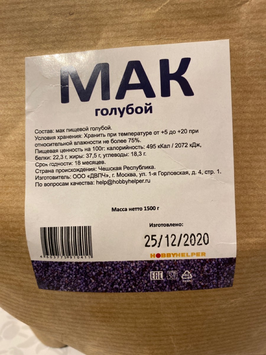 Мак пищевой голубой HOBBYHELPER 1500 г