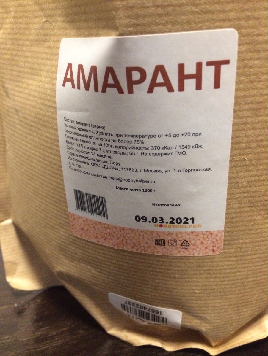 Амарант (зерно/крупа) HOBBYHELPER (1500г) Перу