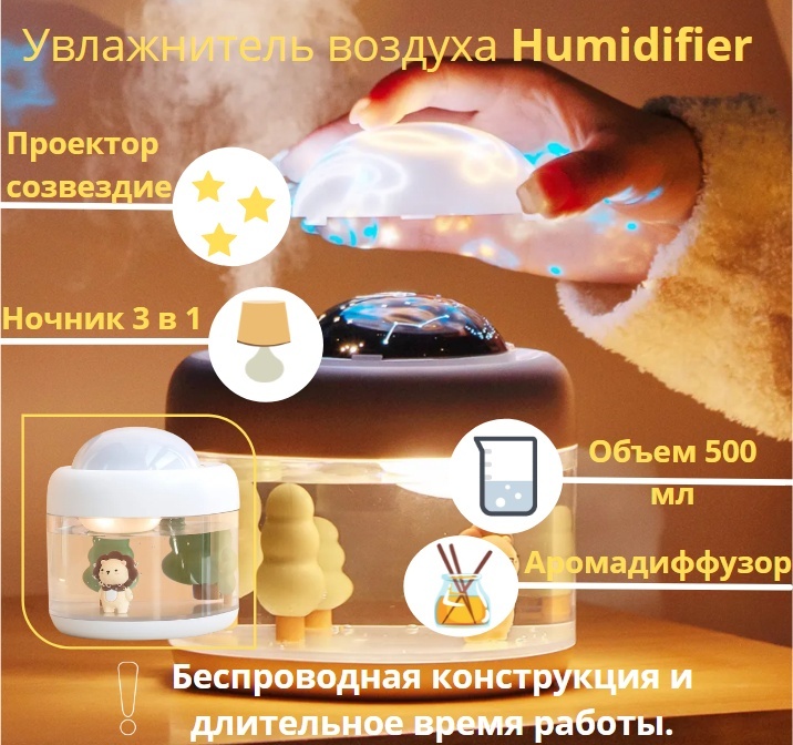 Увлажнитель воздуха Humidifier Проектор созвездие, фигурки лев и лес, светло-розовый, розовый