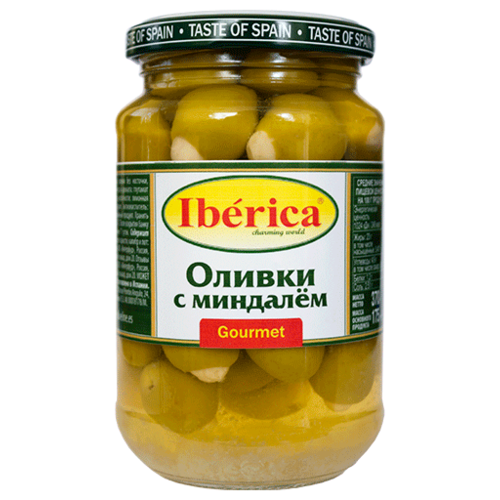 Iberica Оливки с миндалём в рассоле, стеклянная банка 370 г
