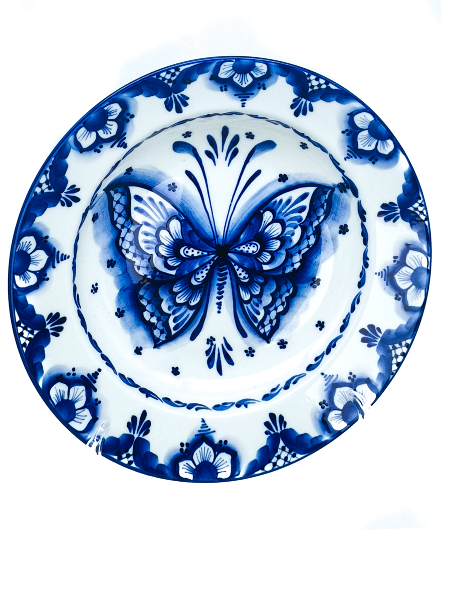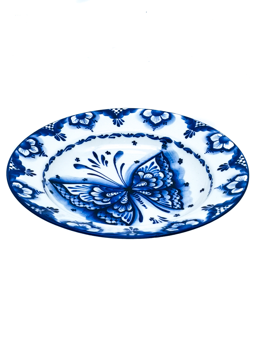 Тарелка суповая 20см. Бабочка. Ручная, авторская роспись Гжель.