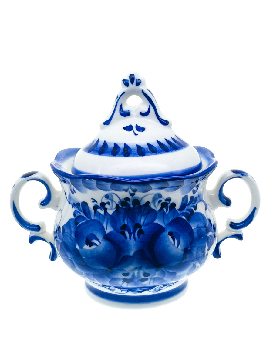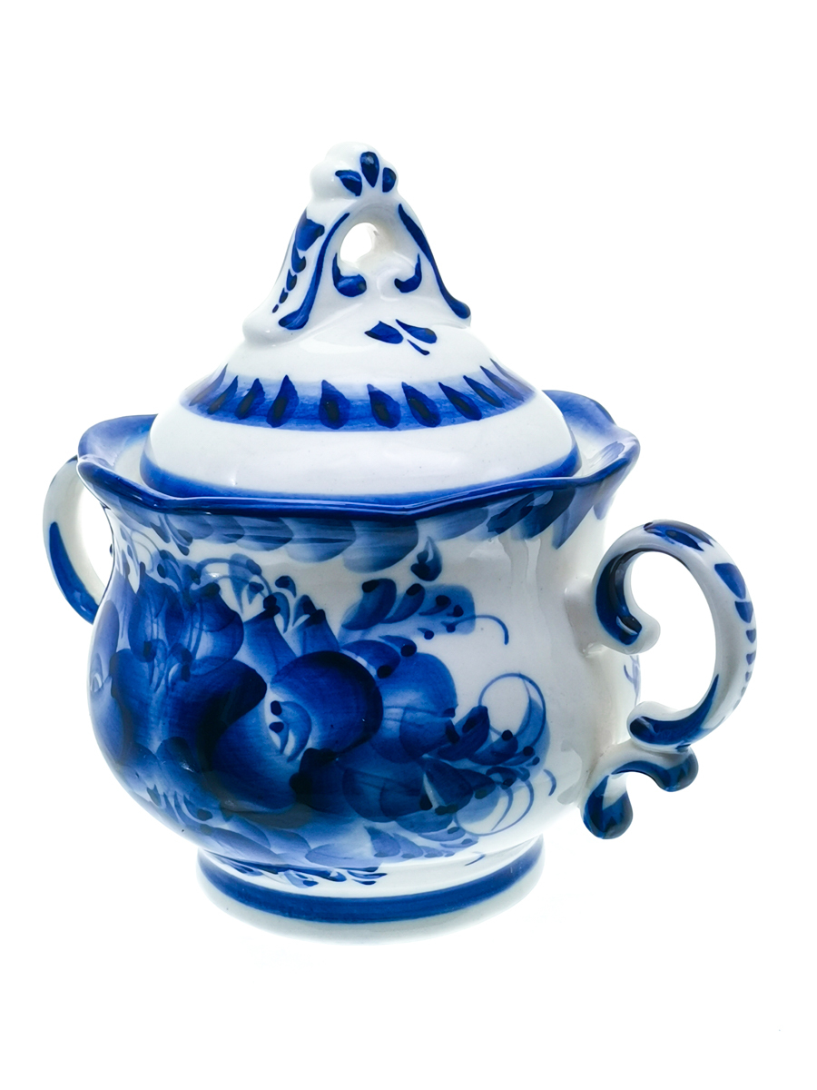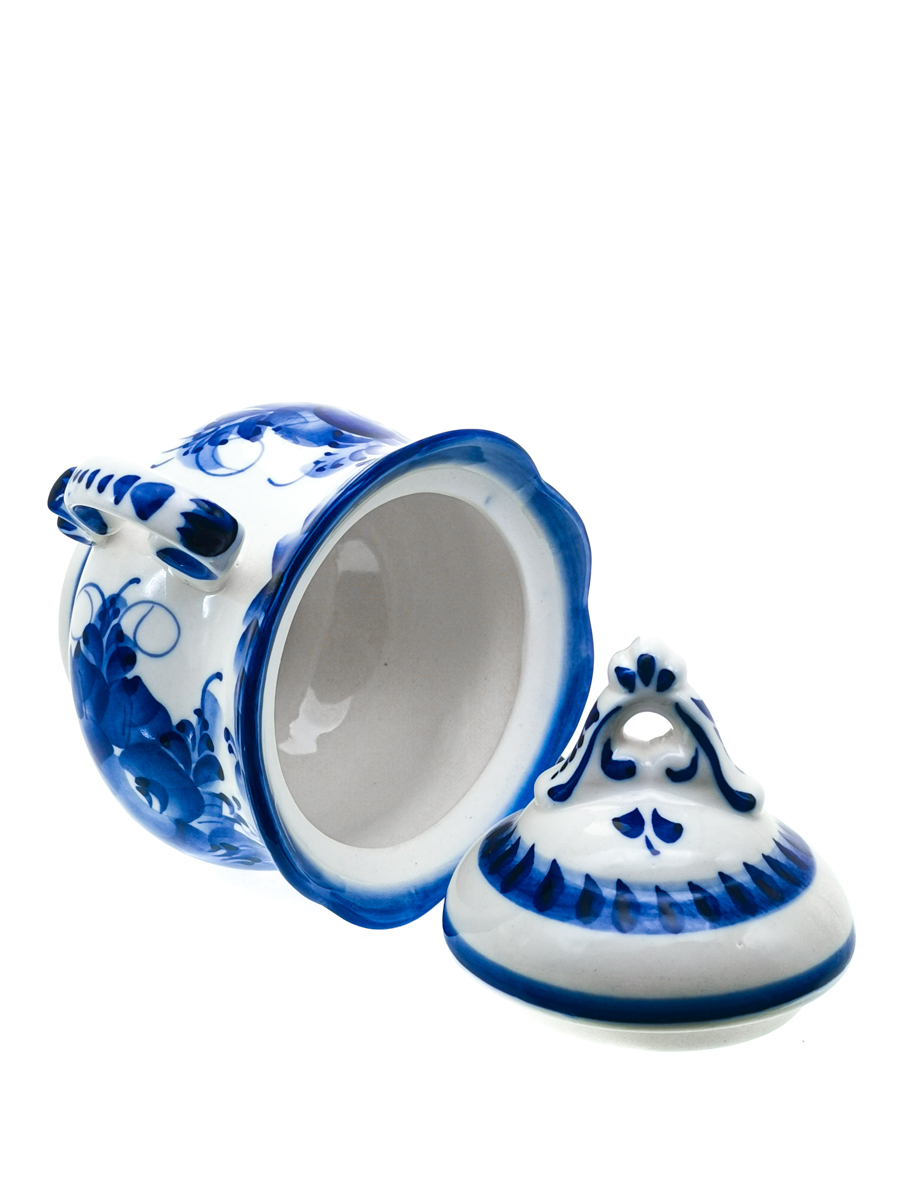 Сахарница "Федот" 14х16см,450мл (белый фарфор). Гжель. Ручная работа. Авторская роспись.