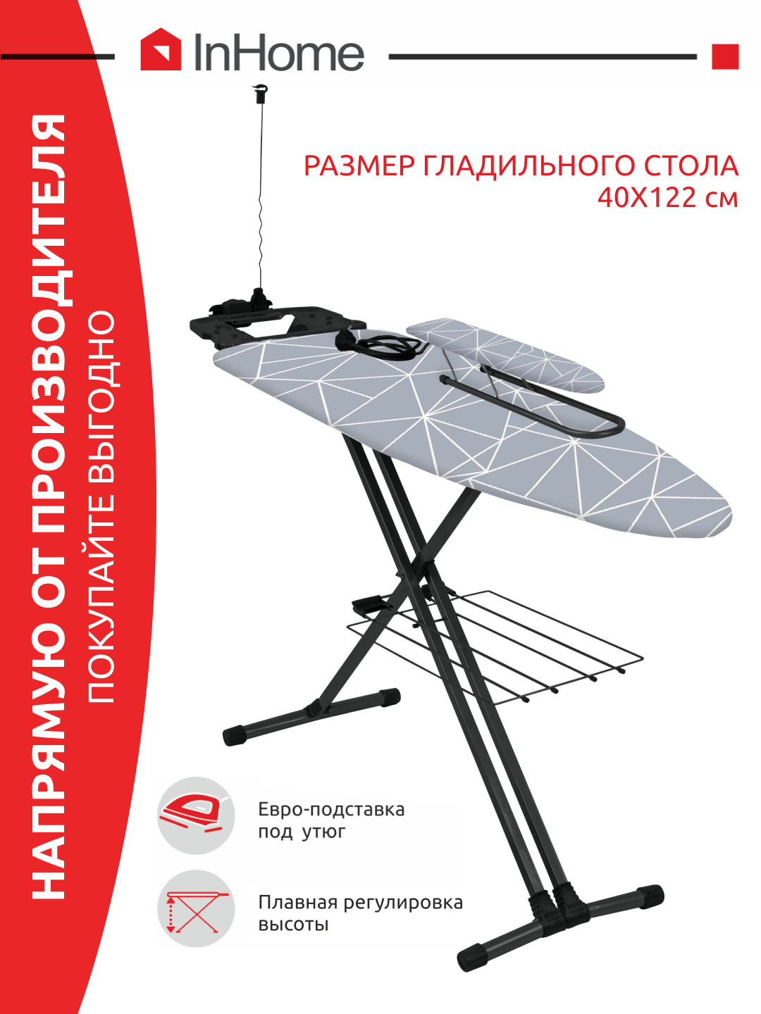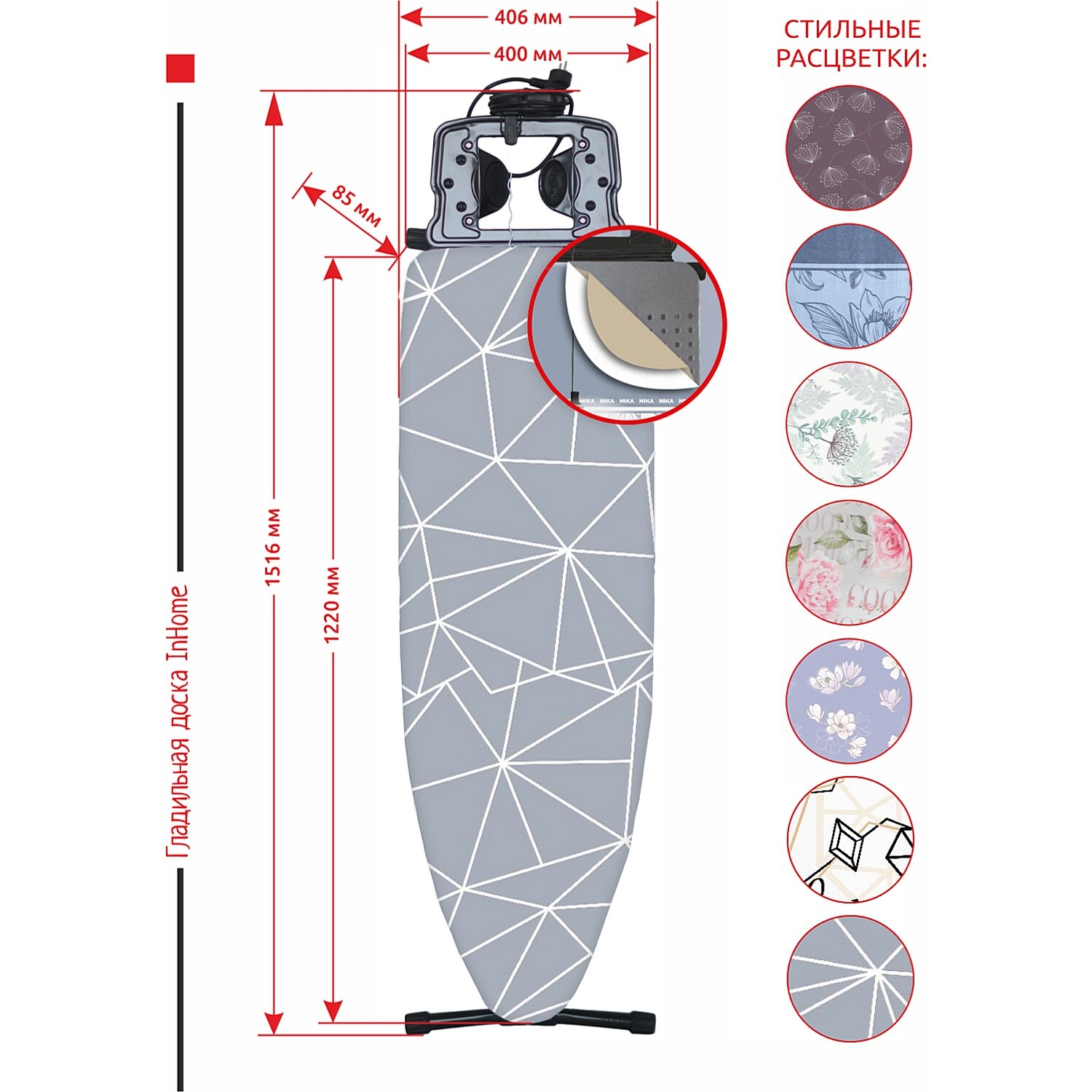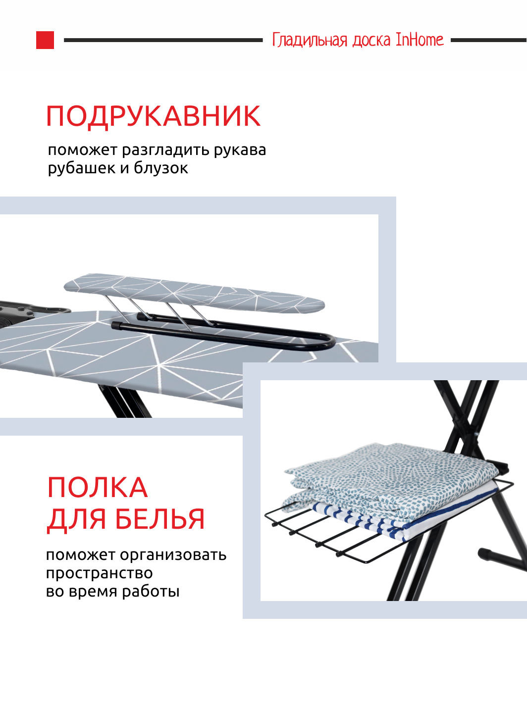 Гладильная доска InHome моноблок (1220х400 мм), подрукавник, удлинитель, полка для белья