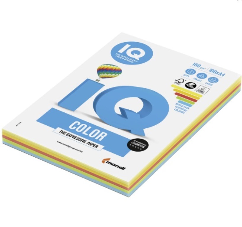 Бумага цветная IQ color, А4, 160 г/м2, 100 л. (5 цветов x 20 листов), интенсив, RB02