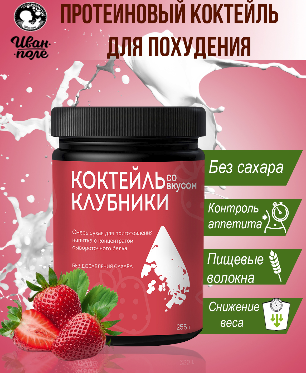 Коктейль молочный Иван-поле Клубника, протеиновый белковый коктейль без сахара для похудения, 255г