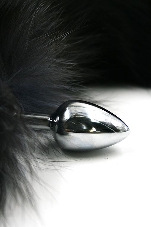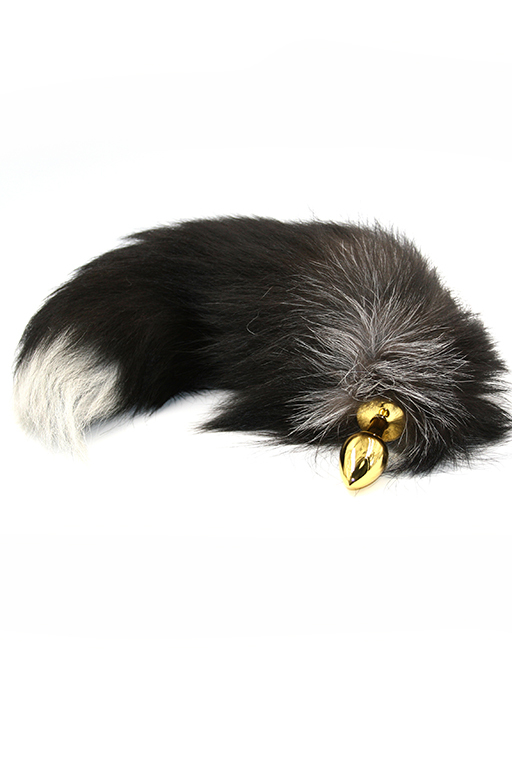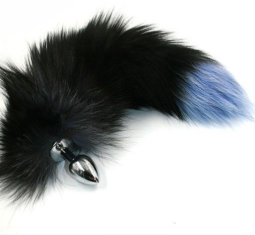 Анальная пробка Kanikule Серебристая с чёрно-голубым хвостом из натурального меха, 27 мм