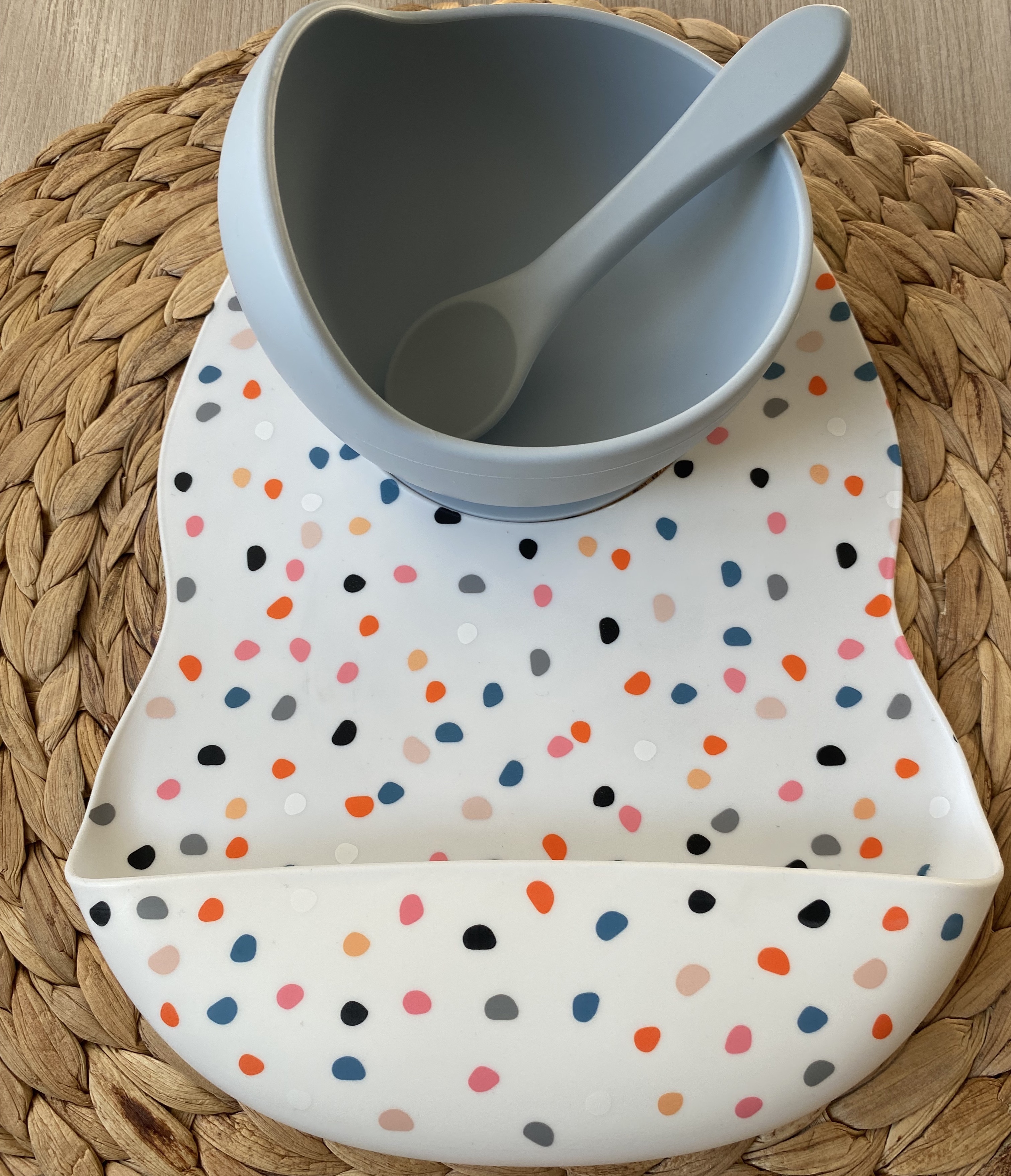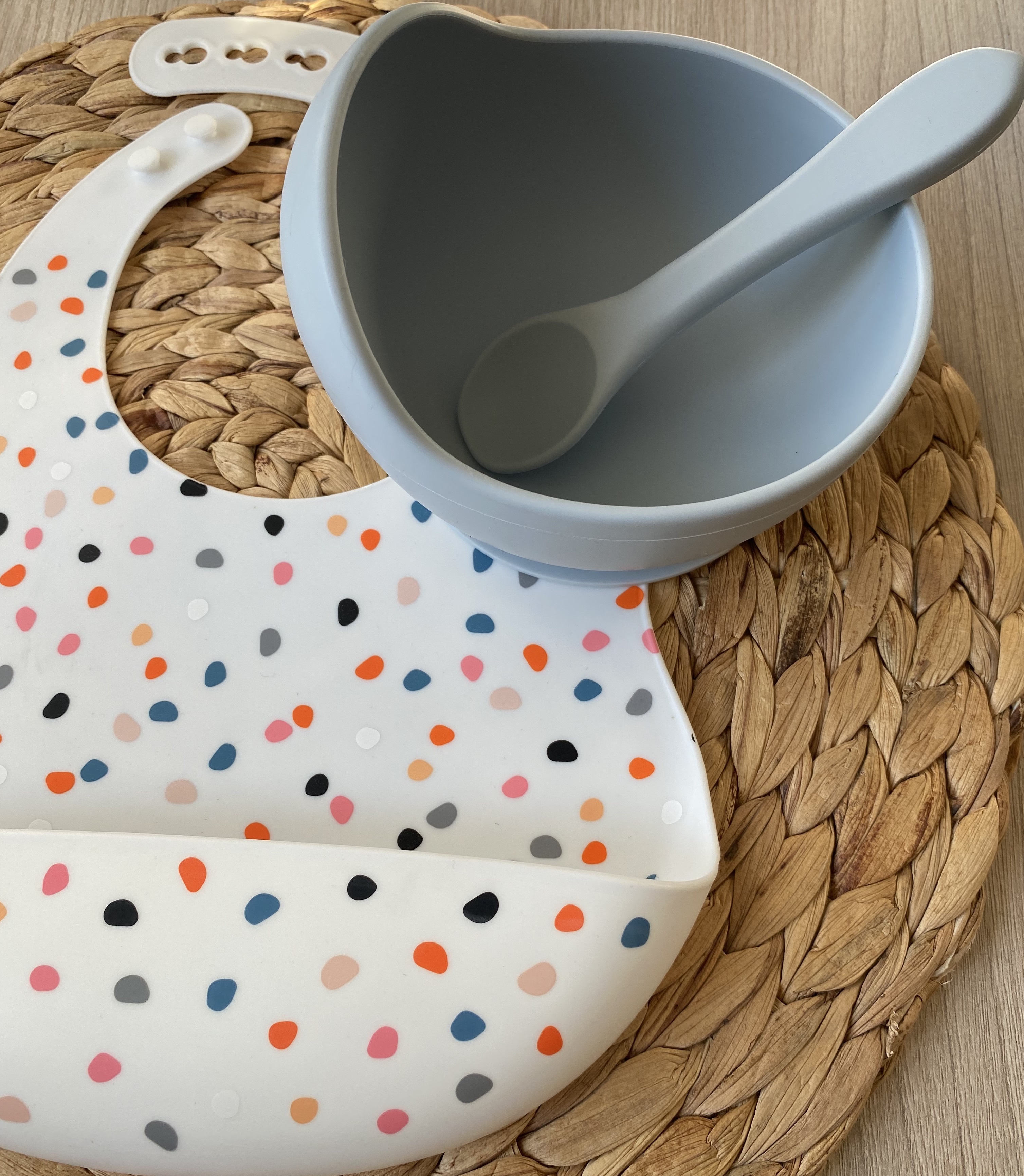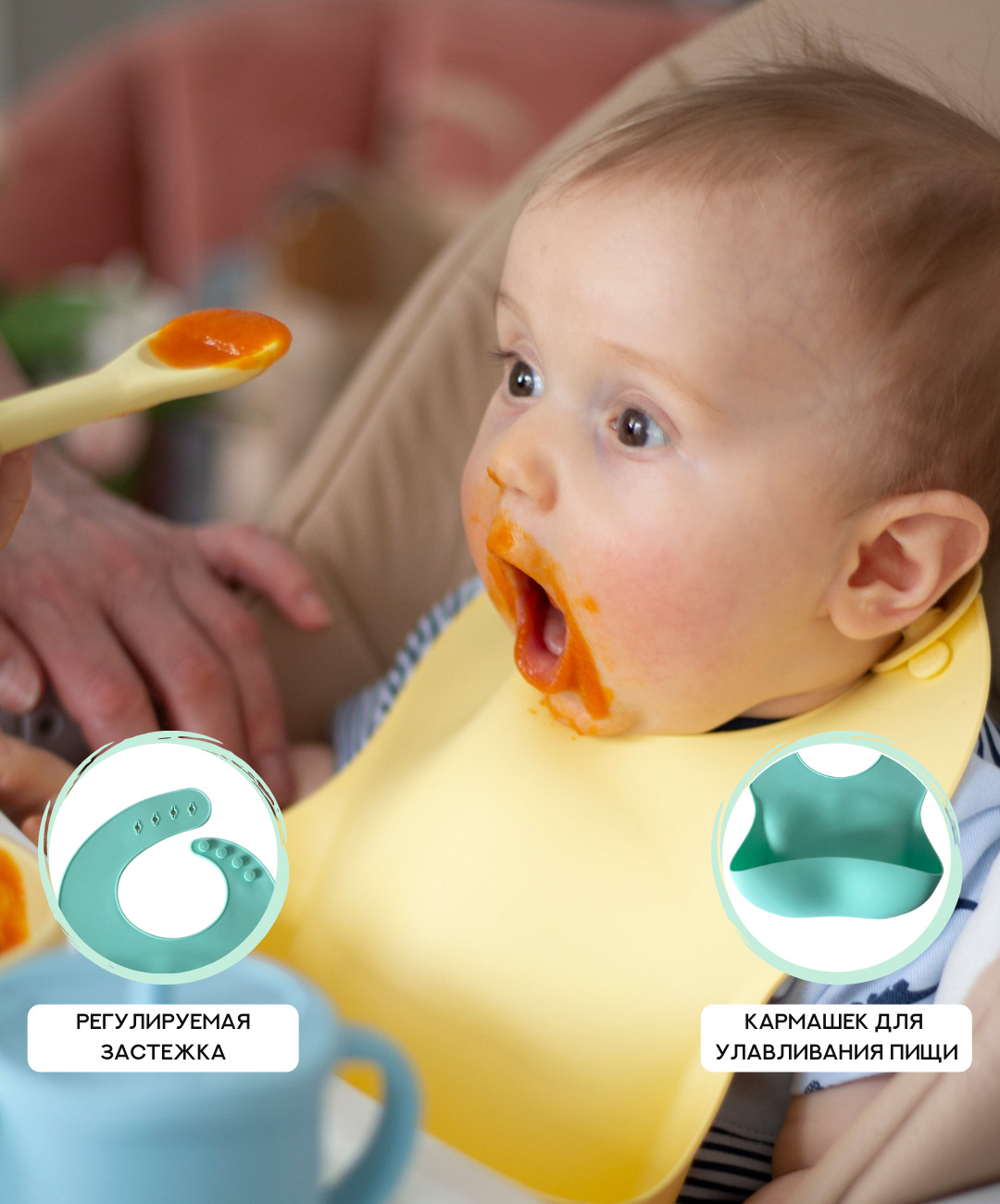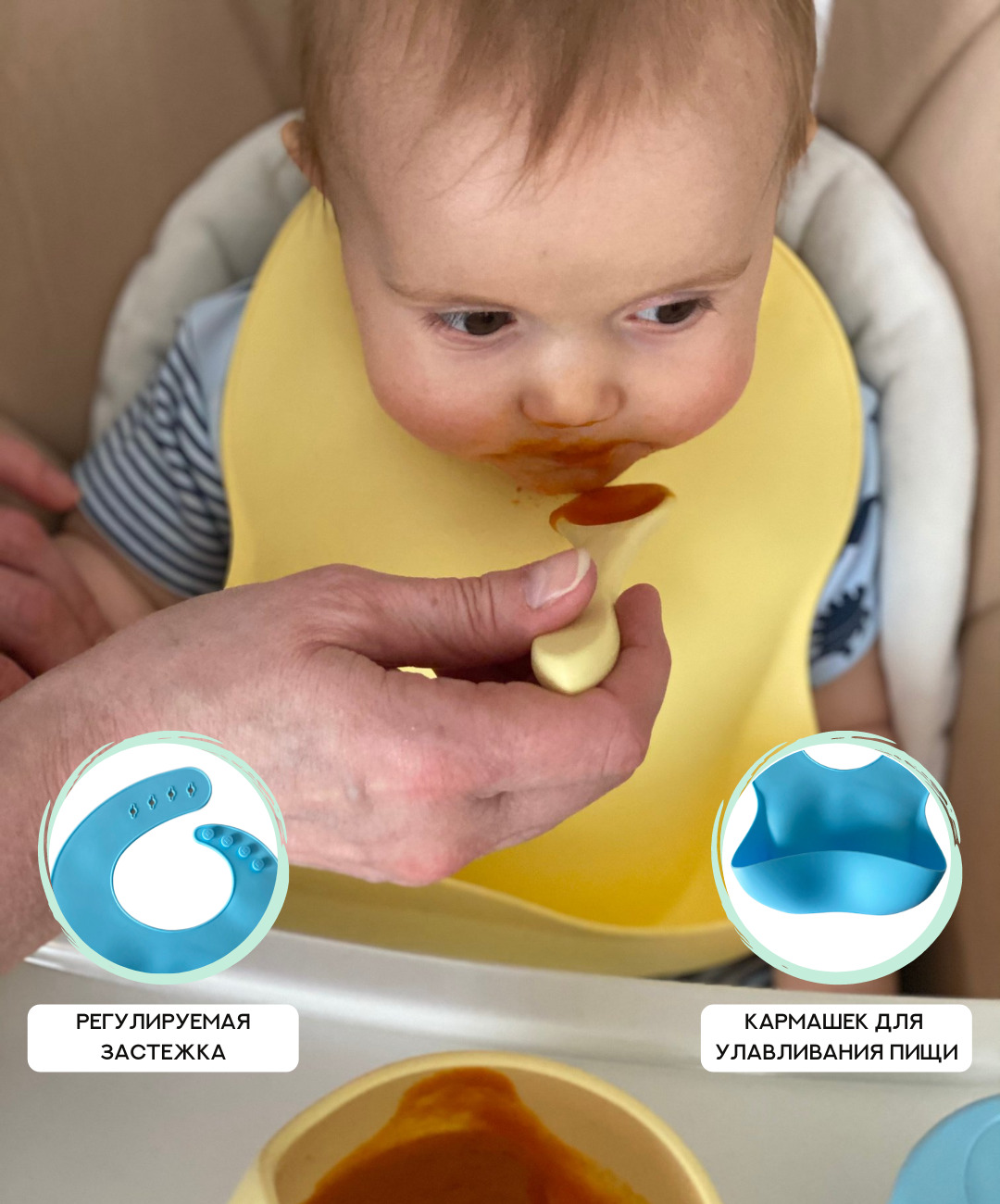Тарелка ложкой силиконовая на присоске и нагрудник/Набор для кормления/Набор для первого прикорма