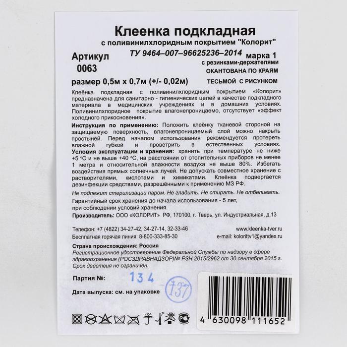 Клеенка подкладная с ПВХ покрытием с резинками окантованная 0,5м*0,7м, наматрасник
