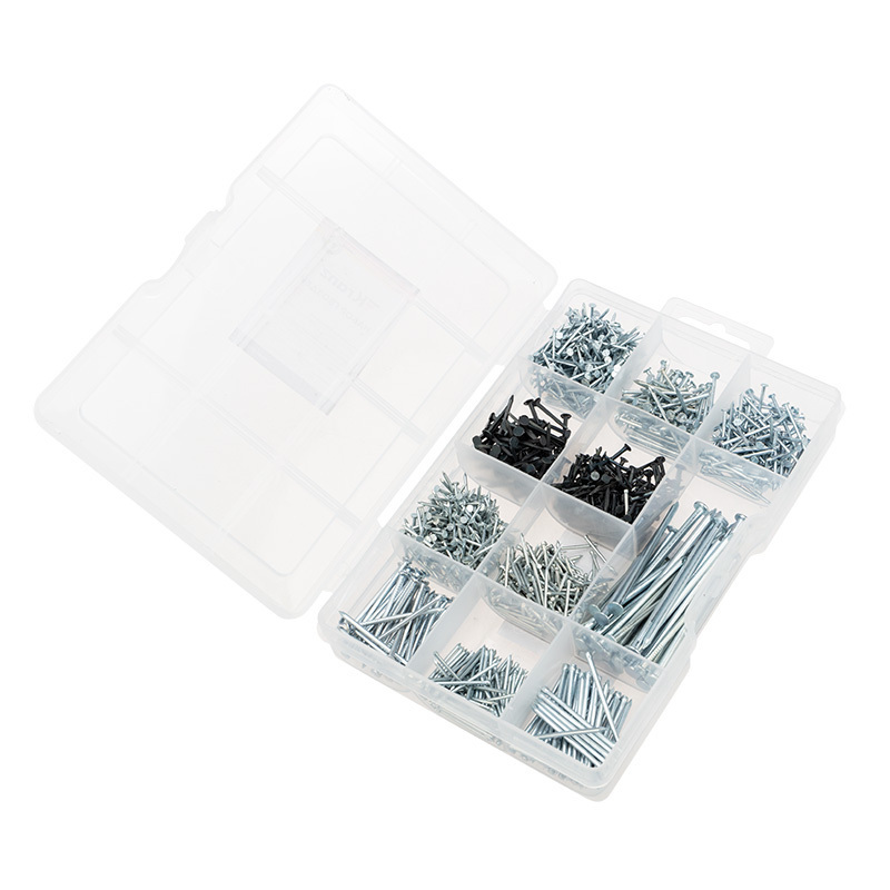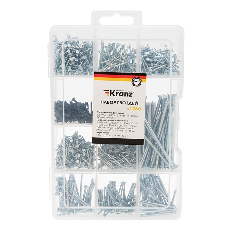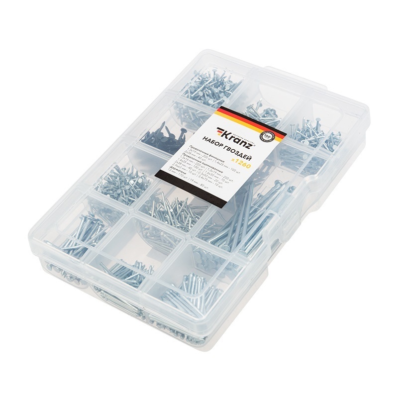 Набор финишных оцинкованных гвоздей Kranz диаметром 1.3-3.4 мм в кейсе, 1260 шт