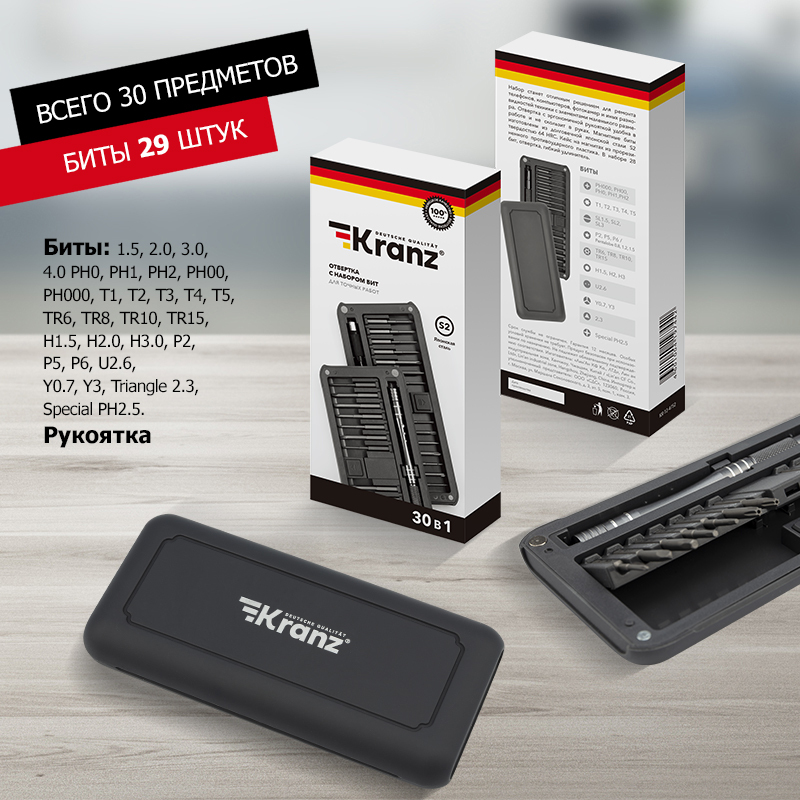 Набор отверток для точных работ KRANZ "30 в 1" в ударопрочном чехле, 29 магнитных бит