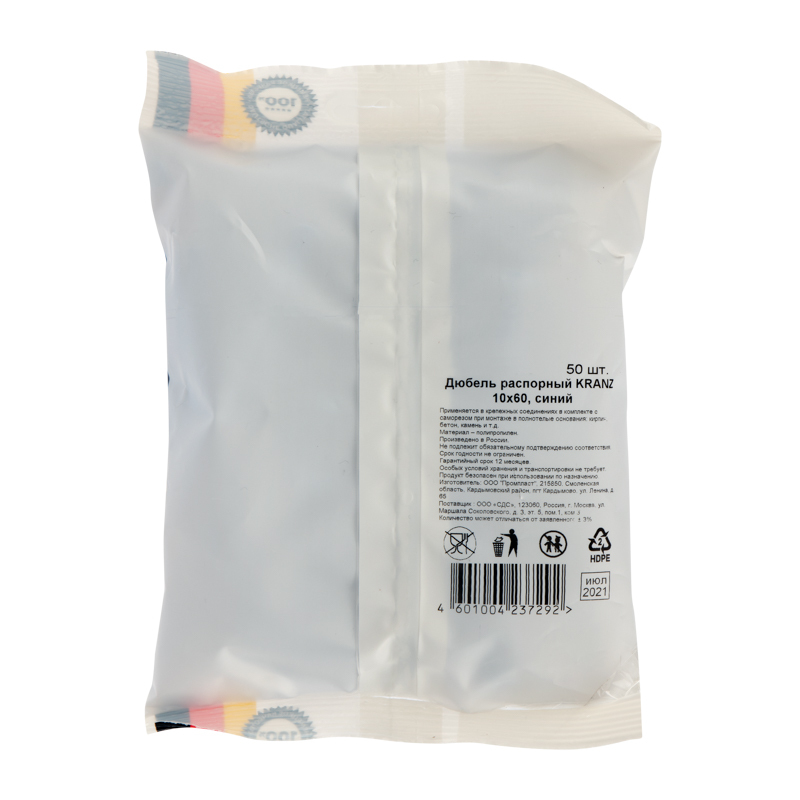 Дюбель распорный KRANZ высокопрочный 10х60, синий, 50 штук в упаковке