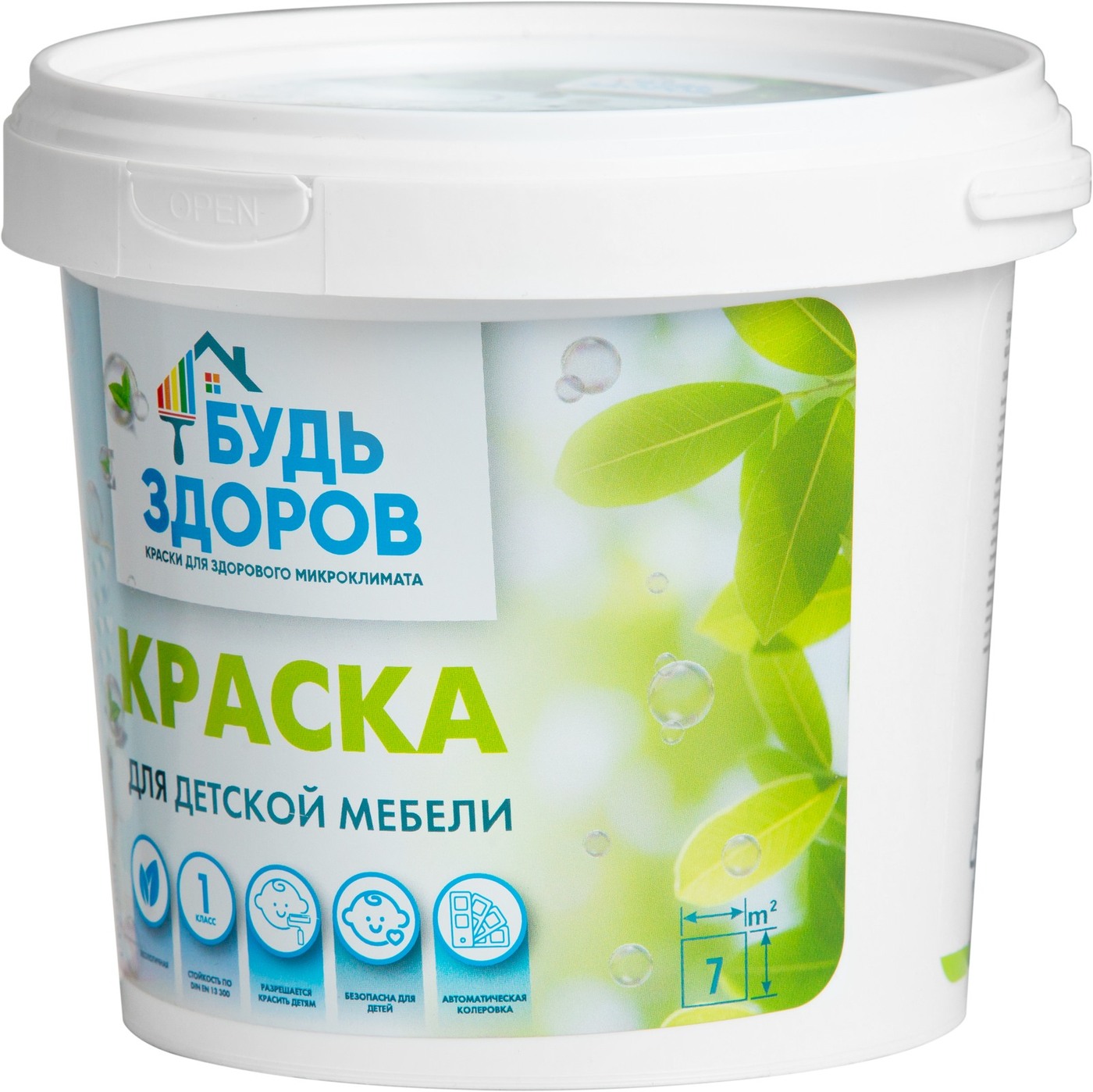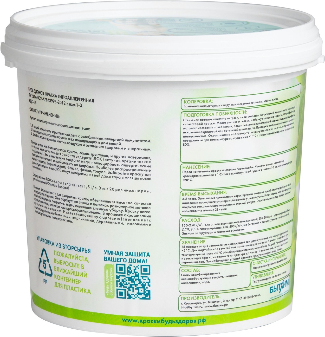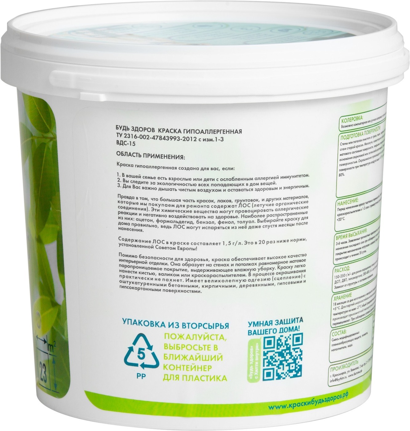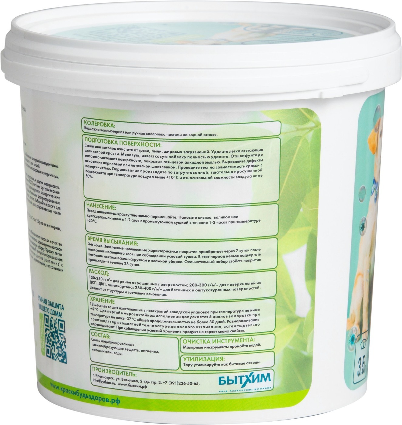 Краска Краски Будь Здоров гипоаллергенная Быстросохнущая, Матовое покрытие, 2,3 л, белый