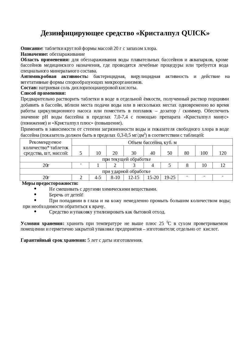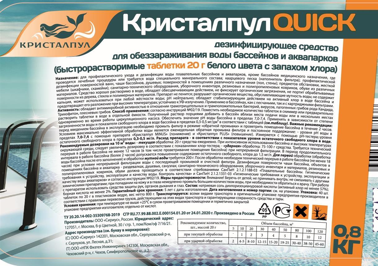 Дезинфицирующее средство "Кристалпул QUICK" для бассейнов, табл.20 г, ведро 0,8 кг