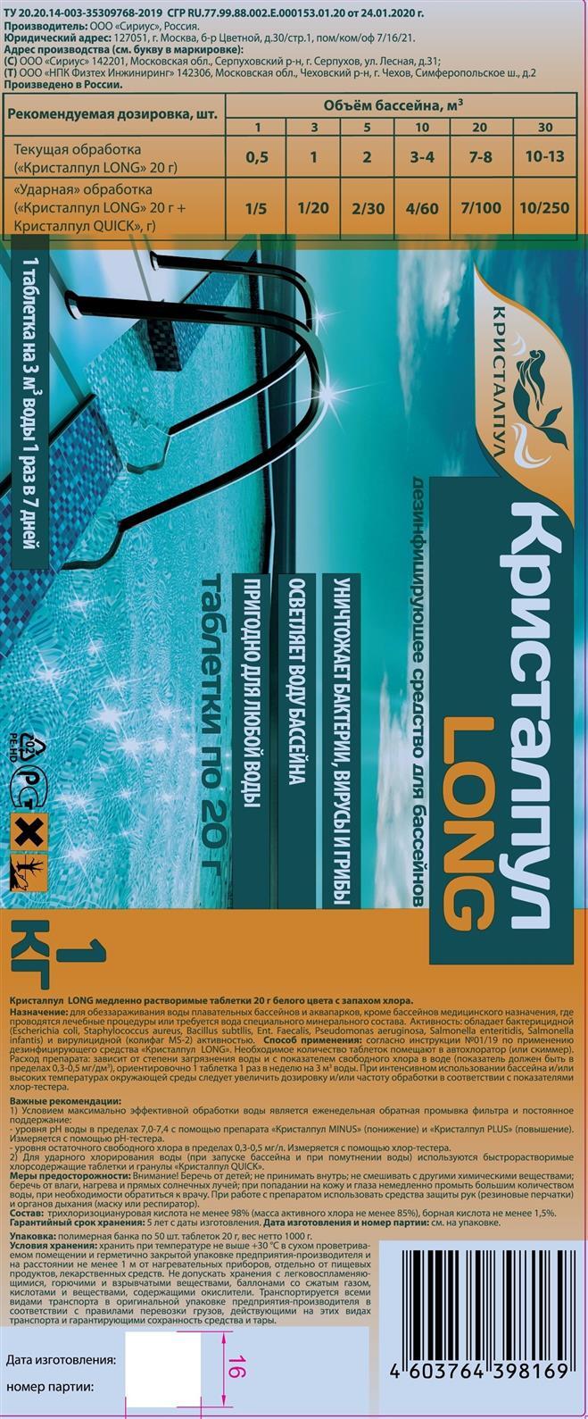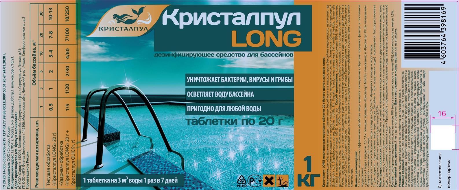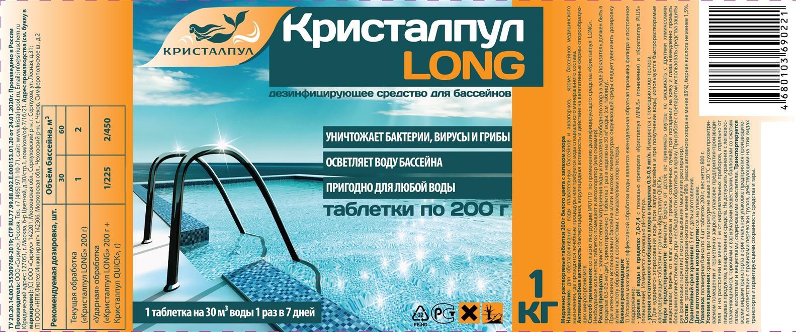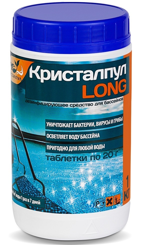 Дезинфицирующее средство "Кристалпул LONG" для бассейнов, табл. 20 г, банка 1 кг