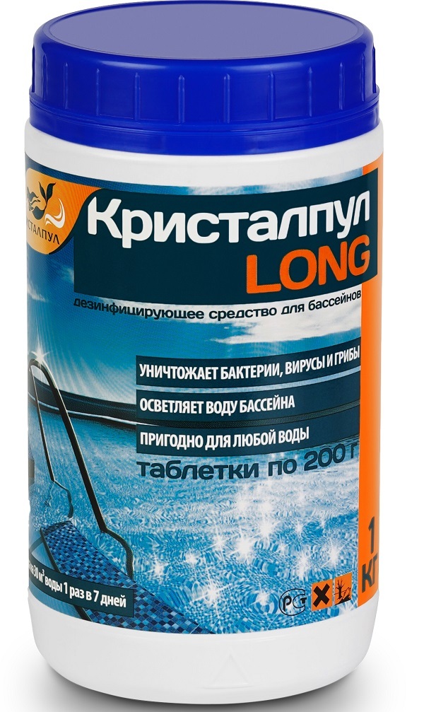 Дезинфицирующее средство "Кристалпул LONG" для бассейнов, табл. 200 г, банка 1 кг