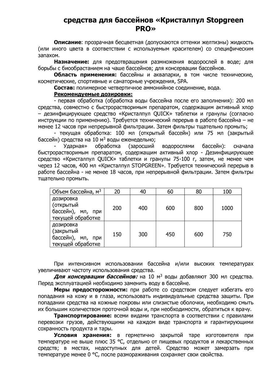 Кристалпул STOPGREEN PRO, флакон 1 л, альгицид
