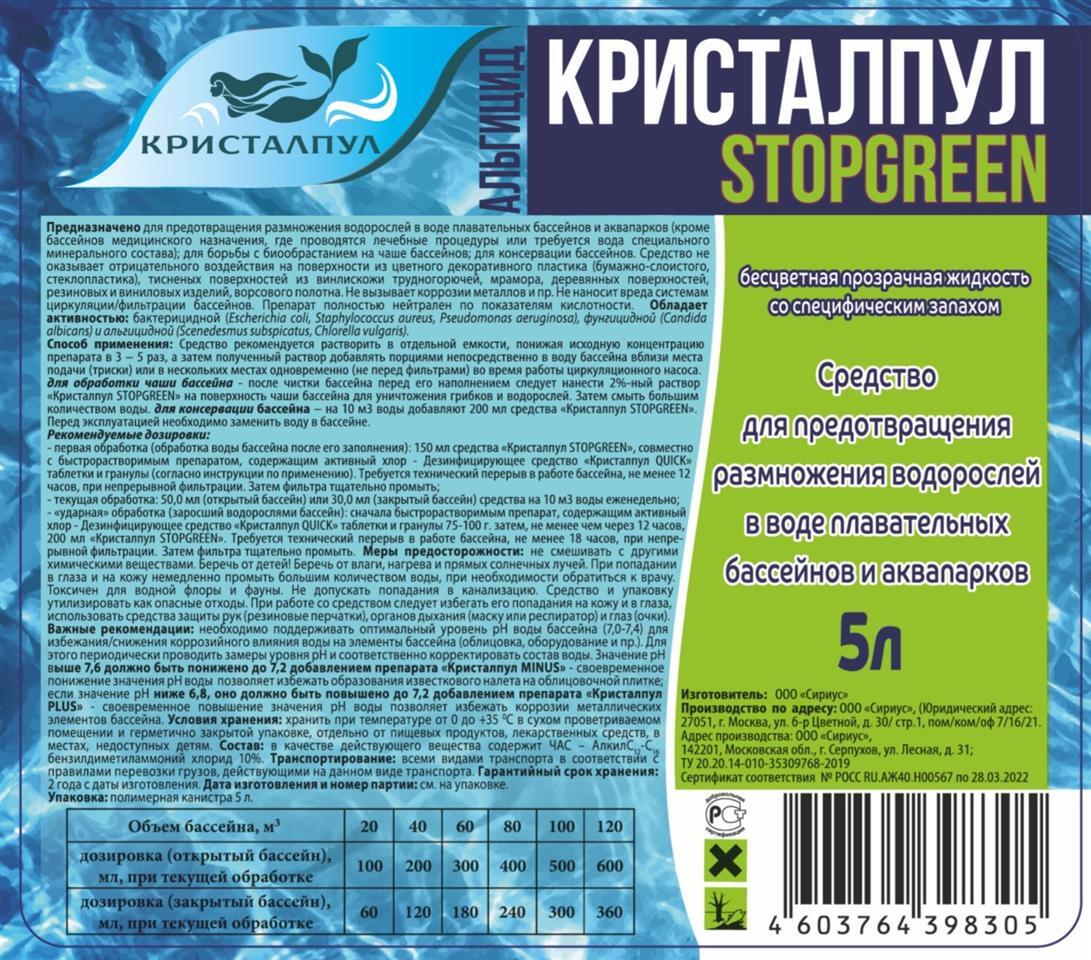 Кристалпул STOPGREEN, канистра 5 л, альгицид