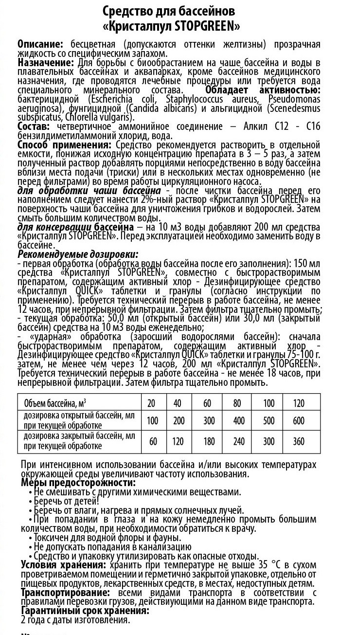 Кристалпул STOPGREEN, флакон 1 л, альгицид