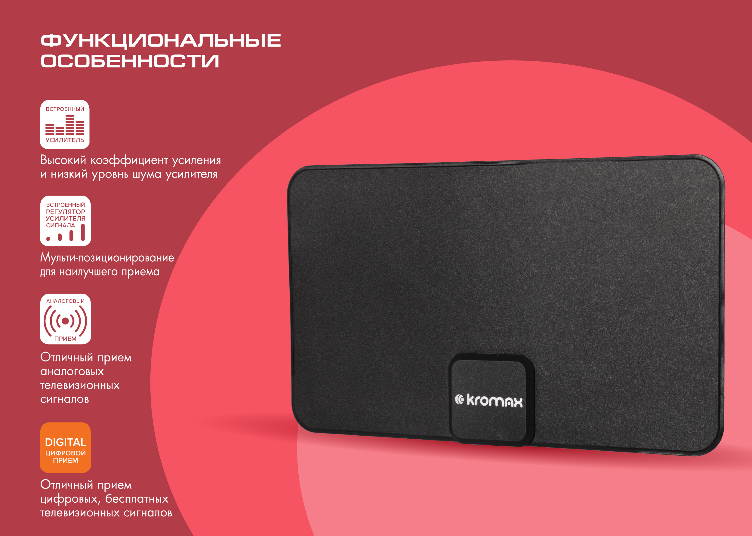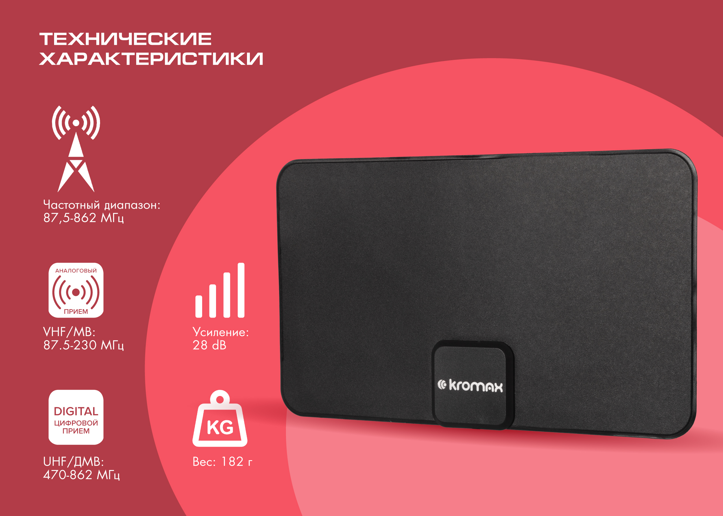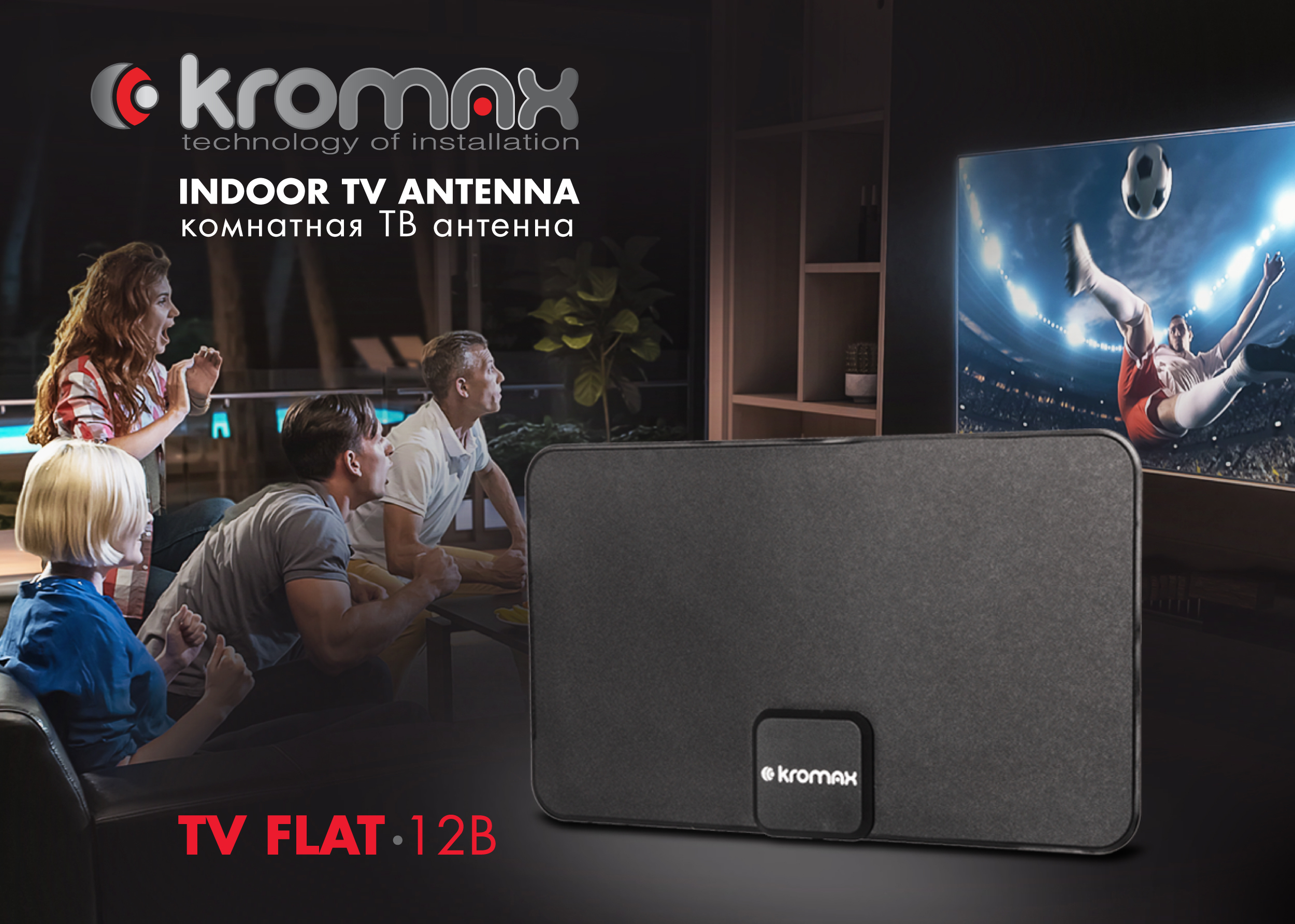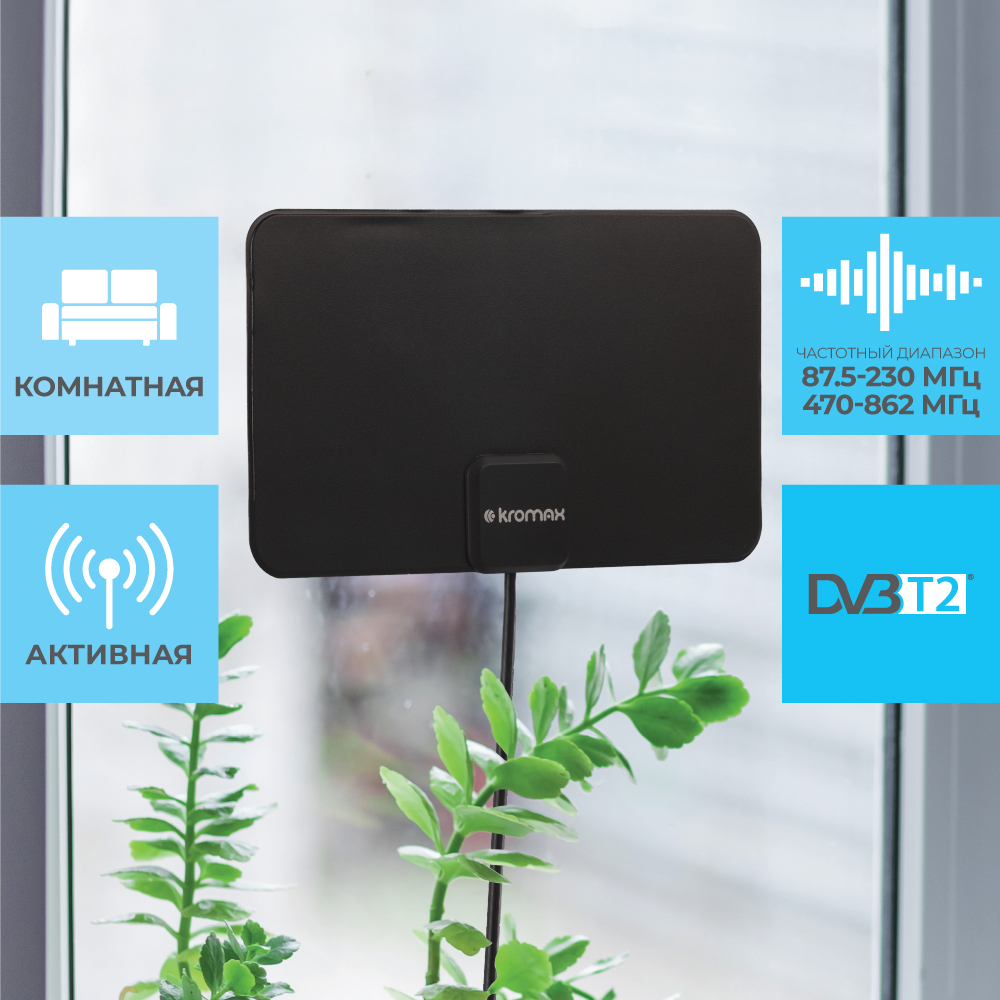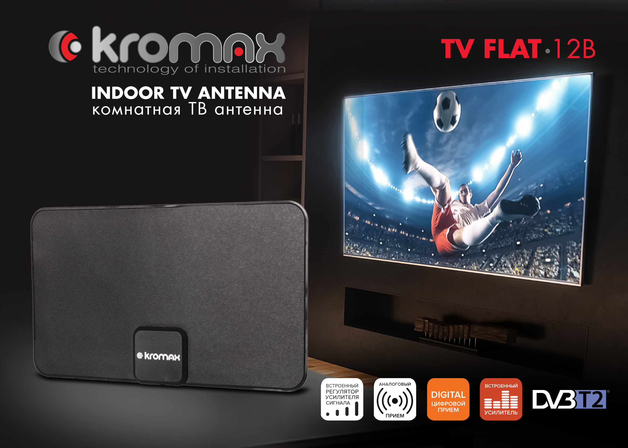 Антенна для цифрового тв телевизионная комнатная активная Kromax TV FLAT-12 black