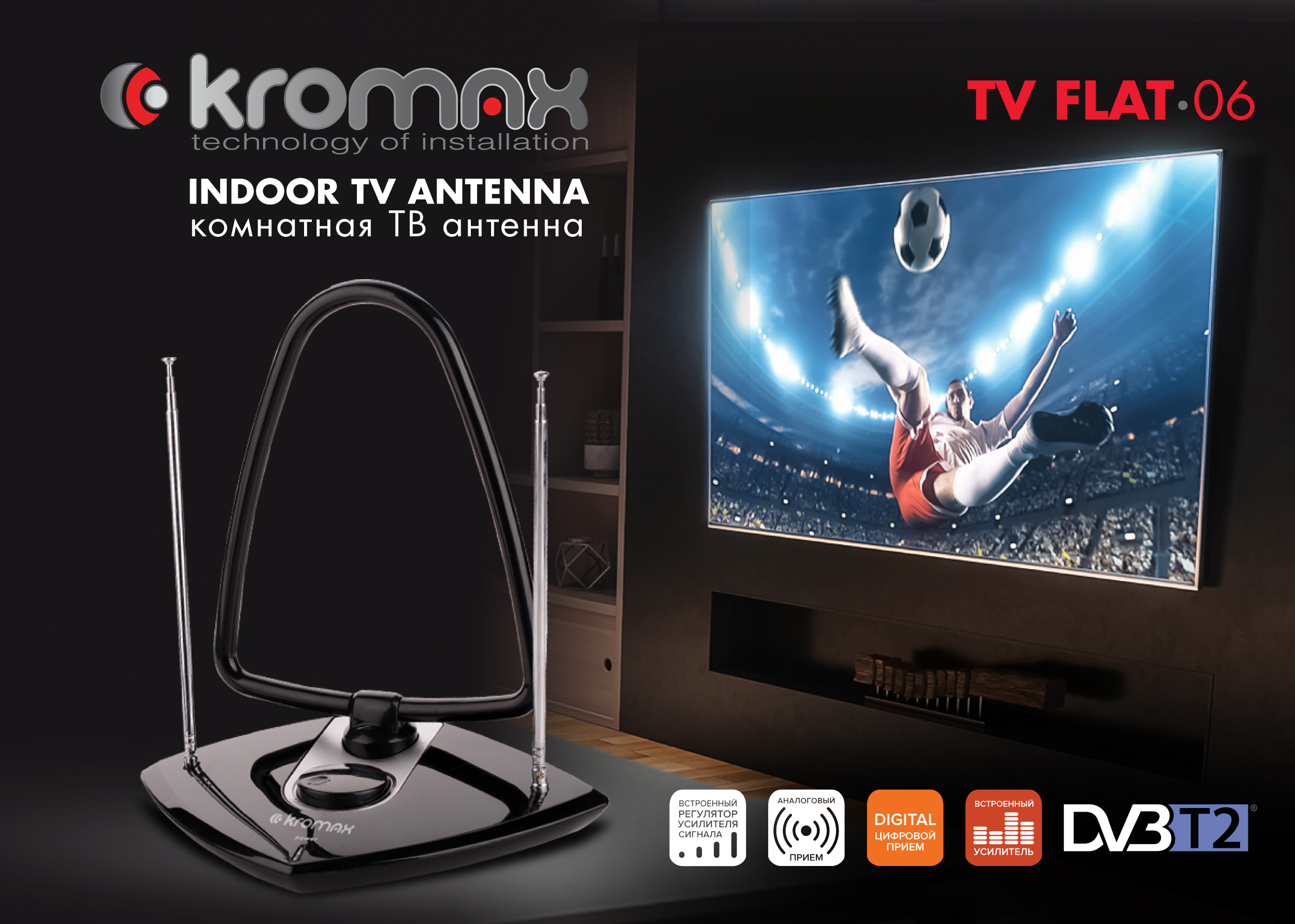 Антенна для цифрового тв телевизионная комнатная активная Kromax TV FLAT-06, поддержка DVB-T2
