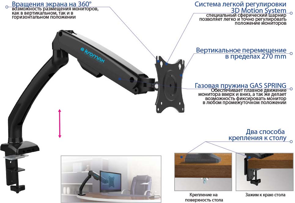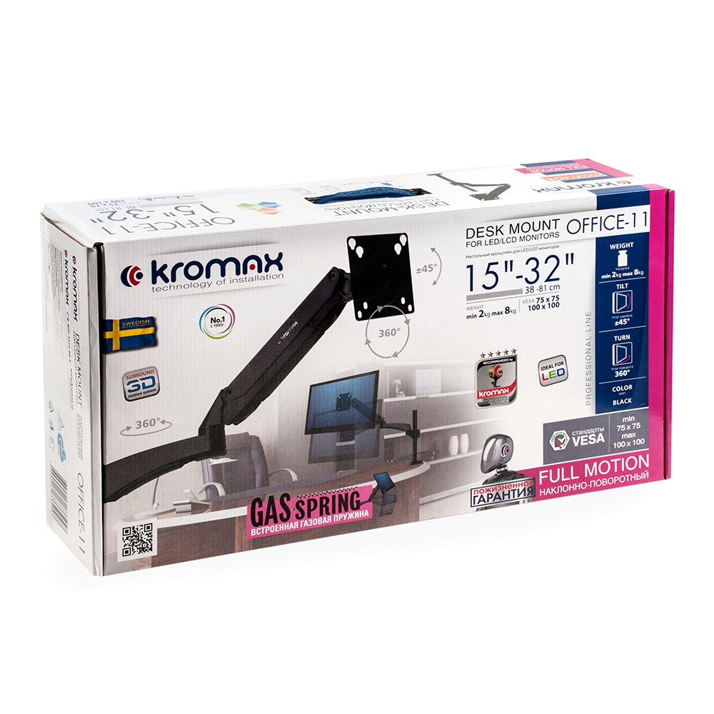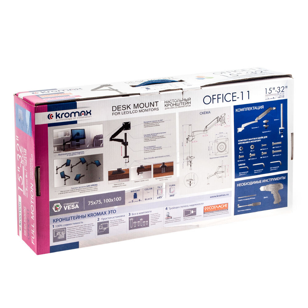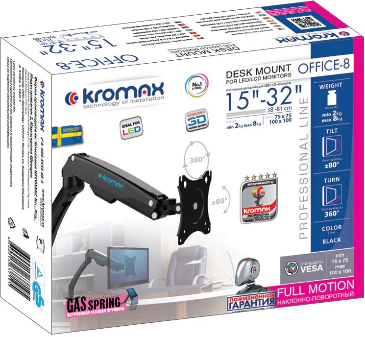 Кронштейн для монитора Kromax OFFICE-8, 15-32 дюймов, настольный, до 8кг, черный