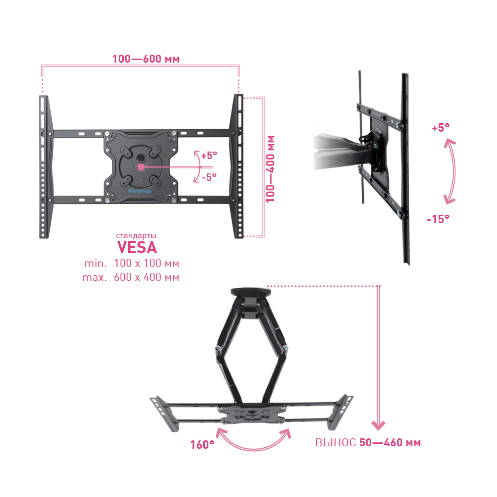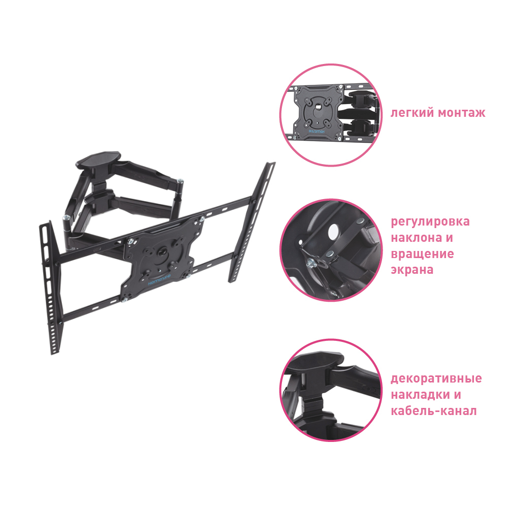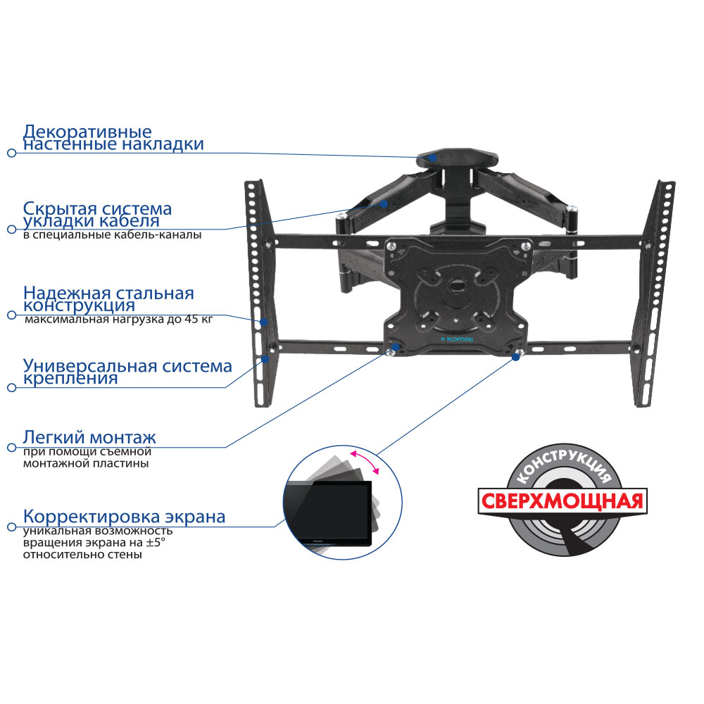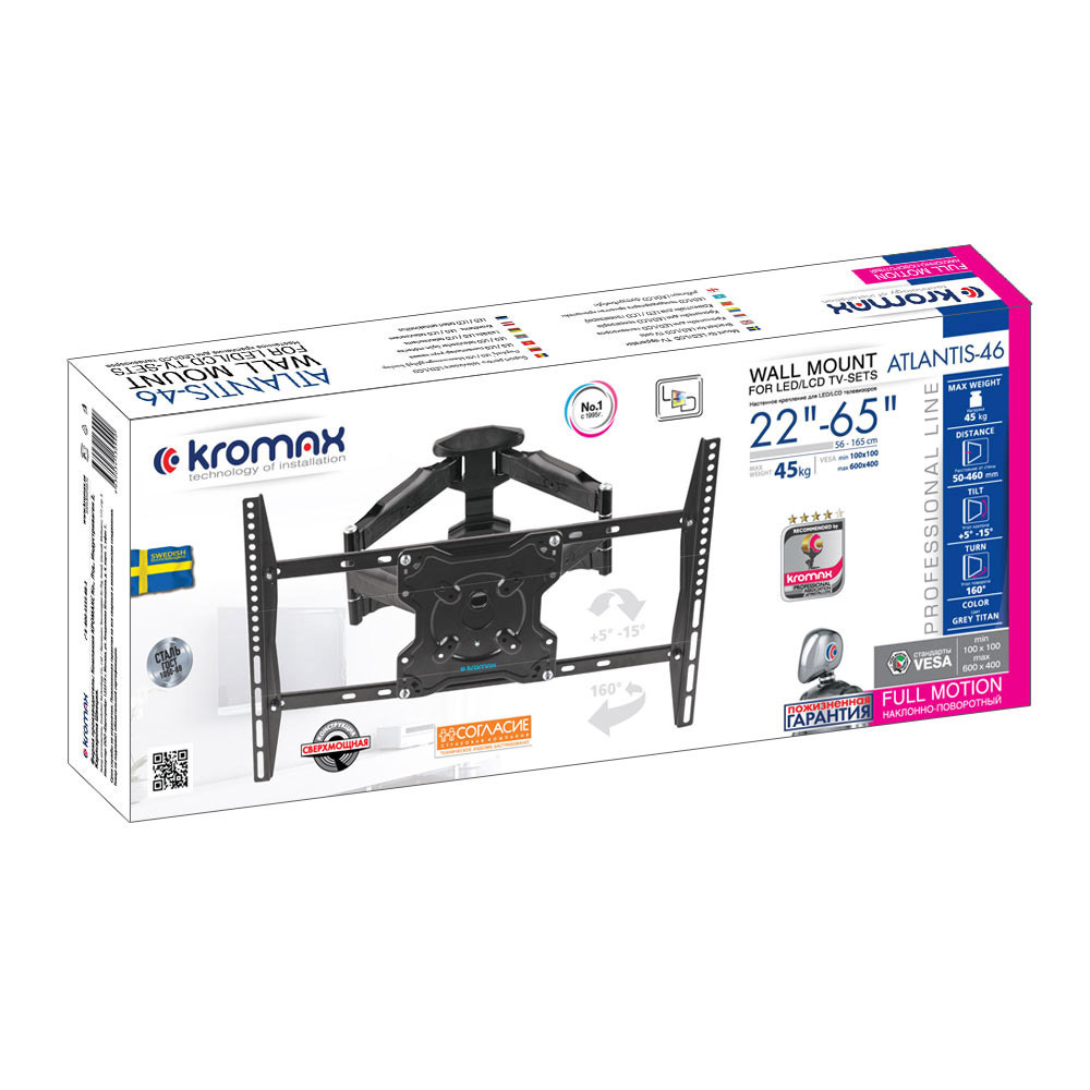 Кронштейн для телевизора настенный наклонно-поворотный Kromax ATLANTIS-15W, 22"-65" до 30 кг