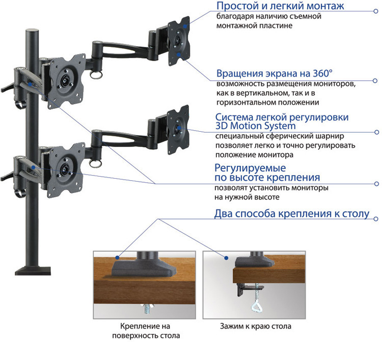 Кронштейн для мониторов ЖК Kromax OFFICE-4 черный 15"-32" макс.8кг настольный поворот и наклон