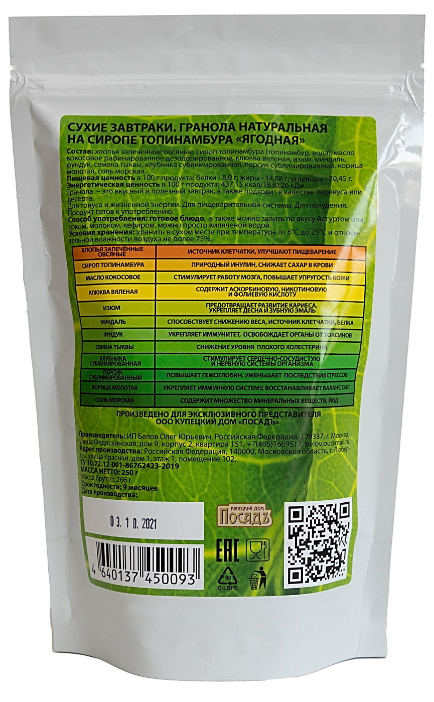 Гранола натуральная на сиропе топинамбура ягодная без сахара 250г