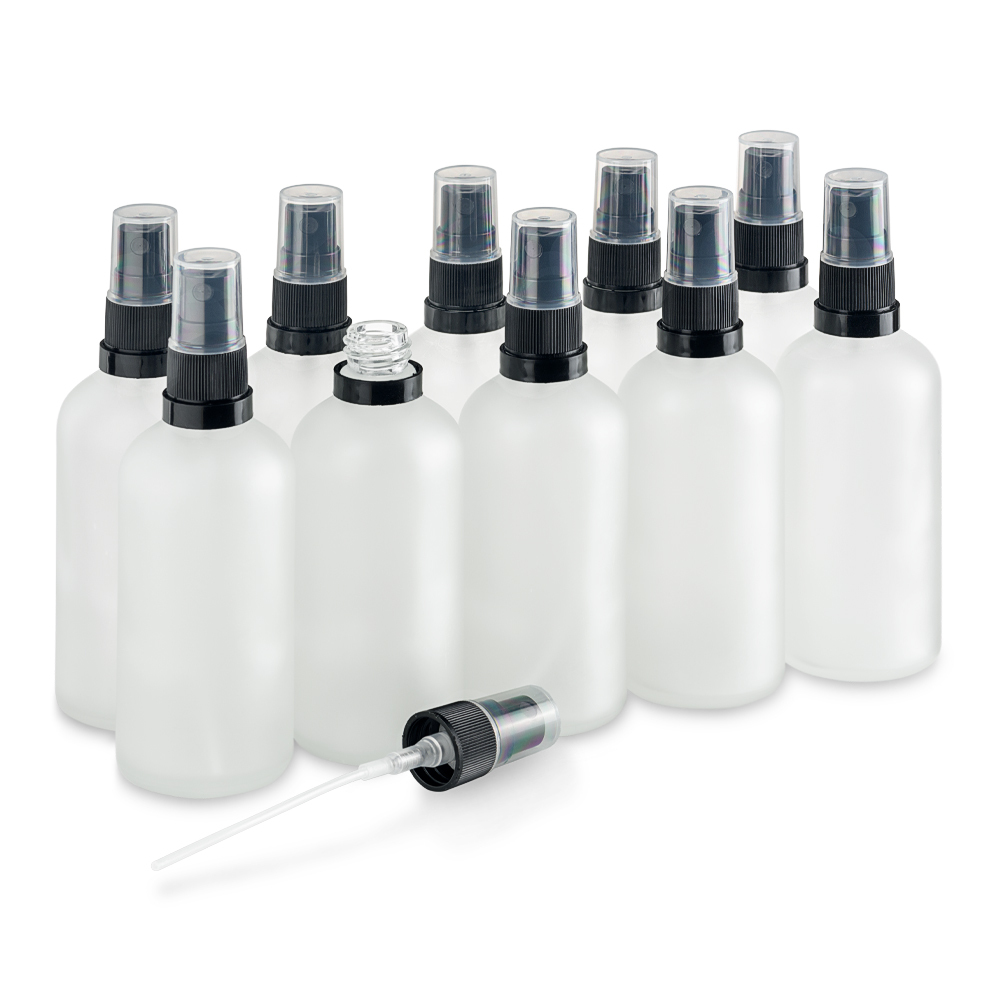 Флакон 100 мл бесцветный матовый с черным спреем-распылителем. Набор 10 штук.