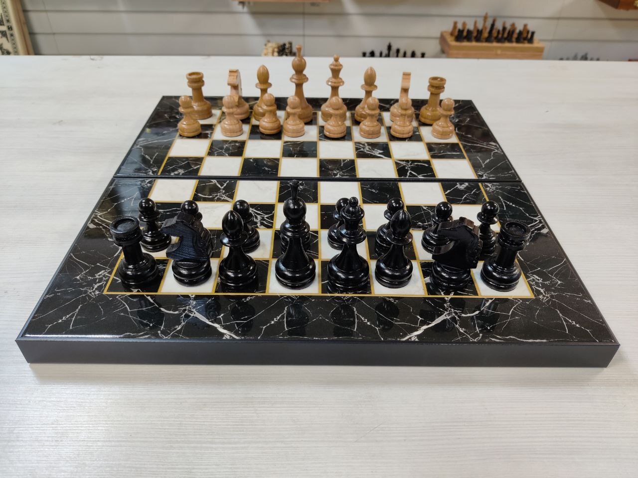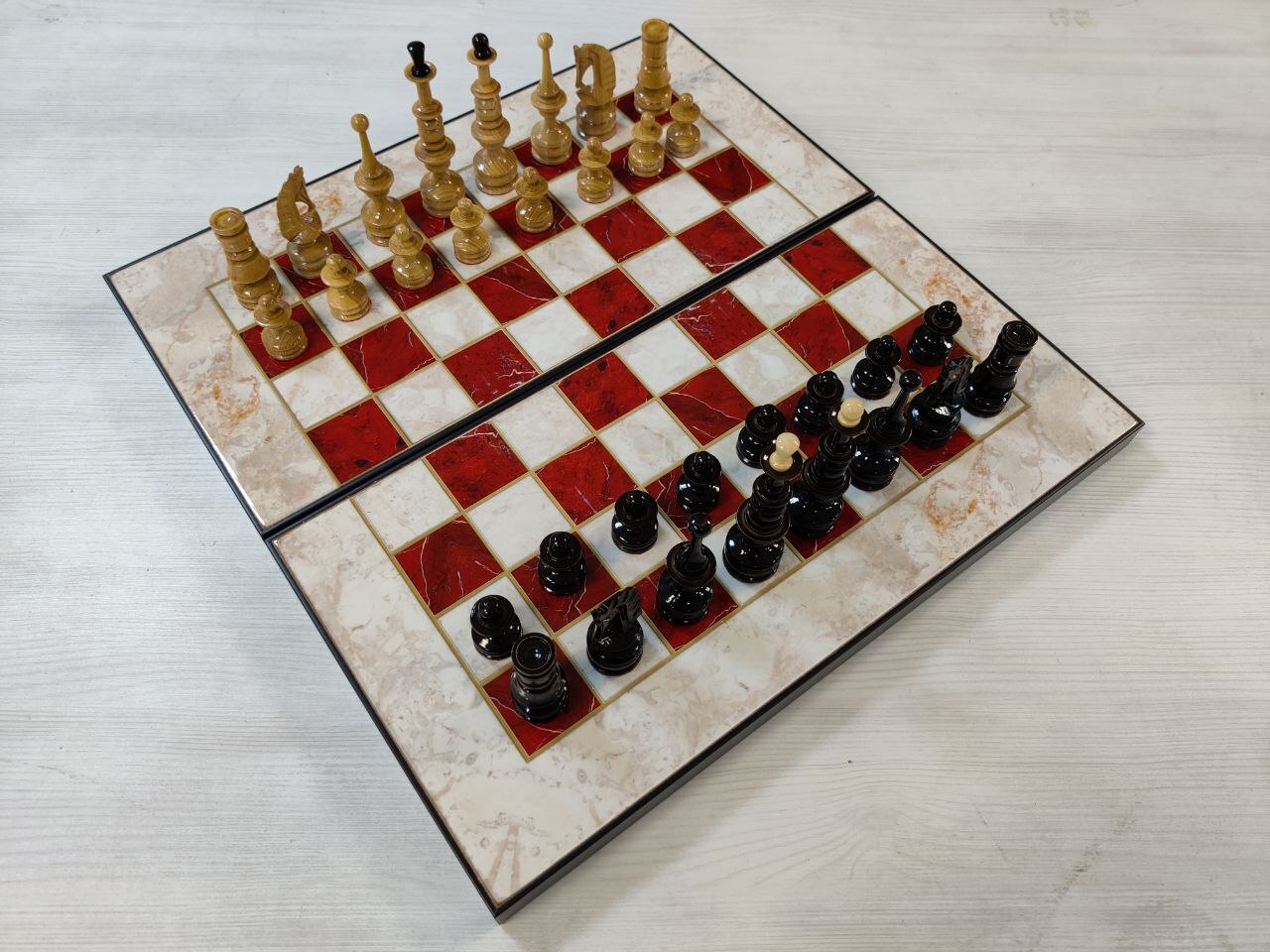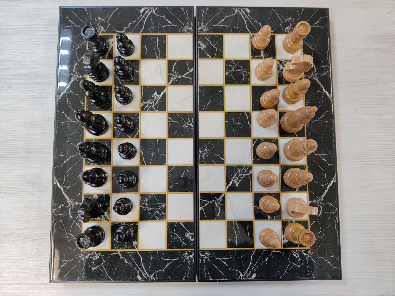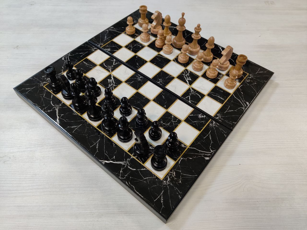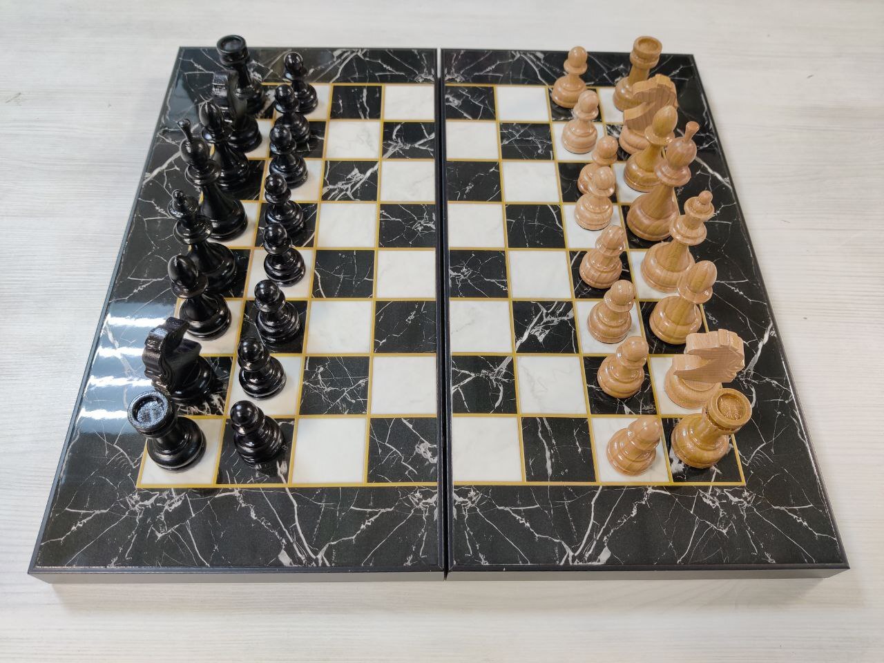 Шахматы с нардами под Мрамор с фигурами из бука