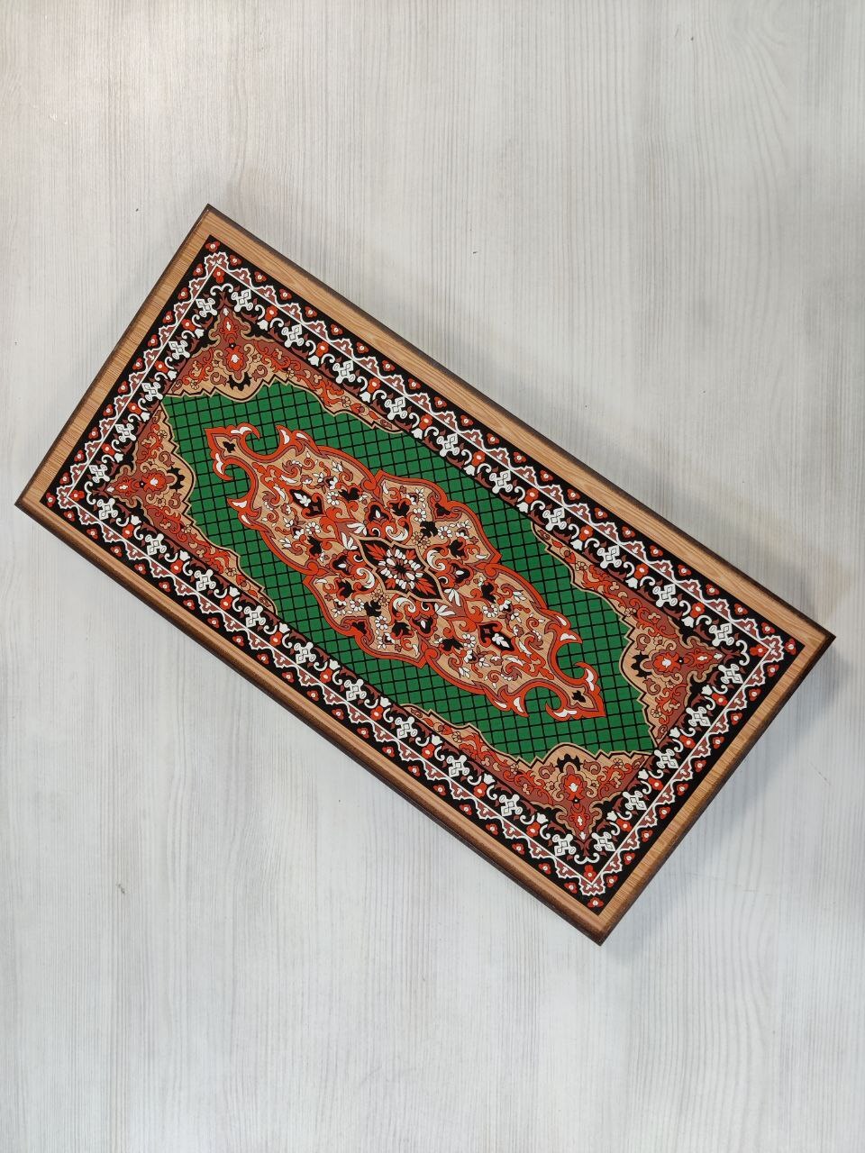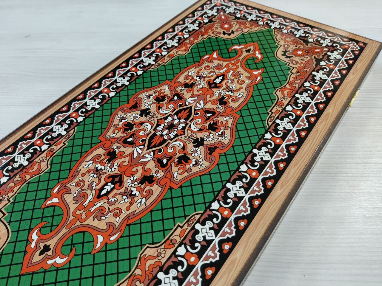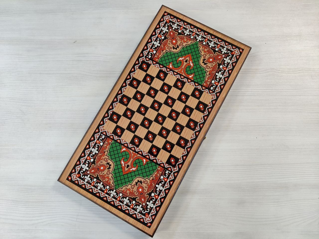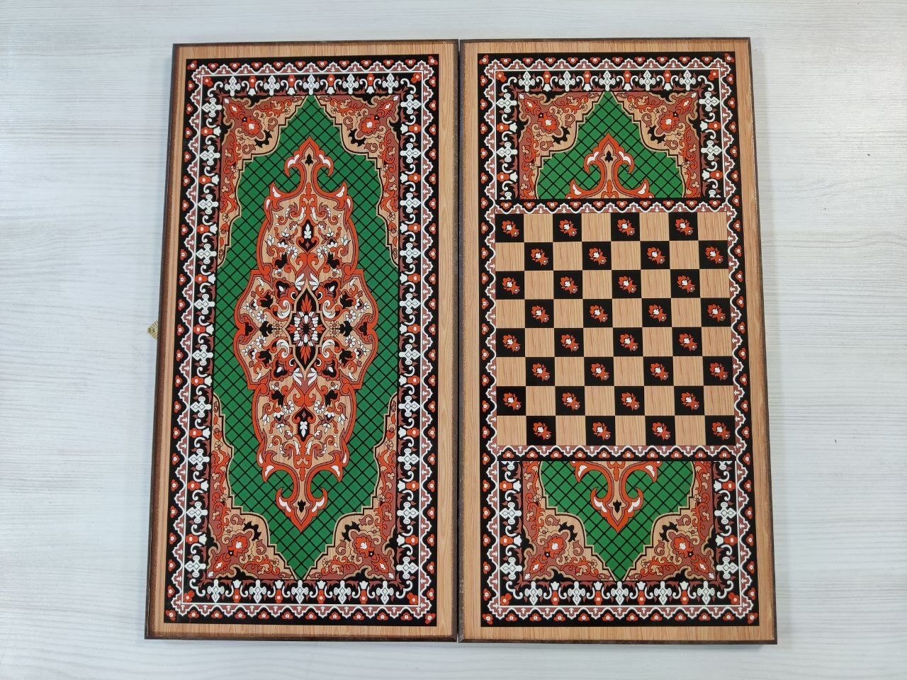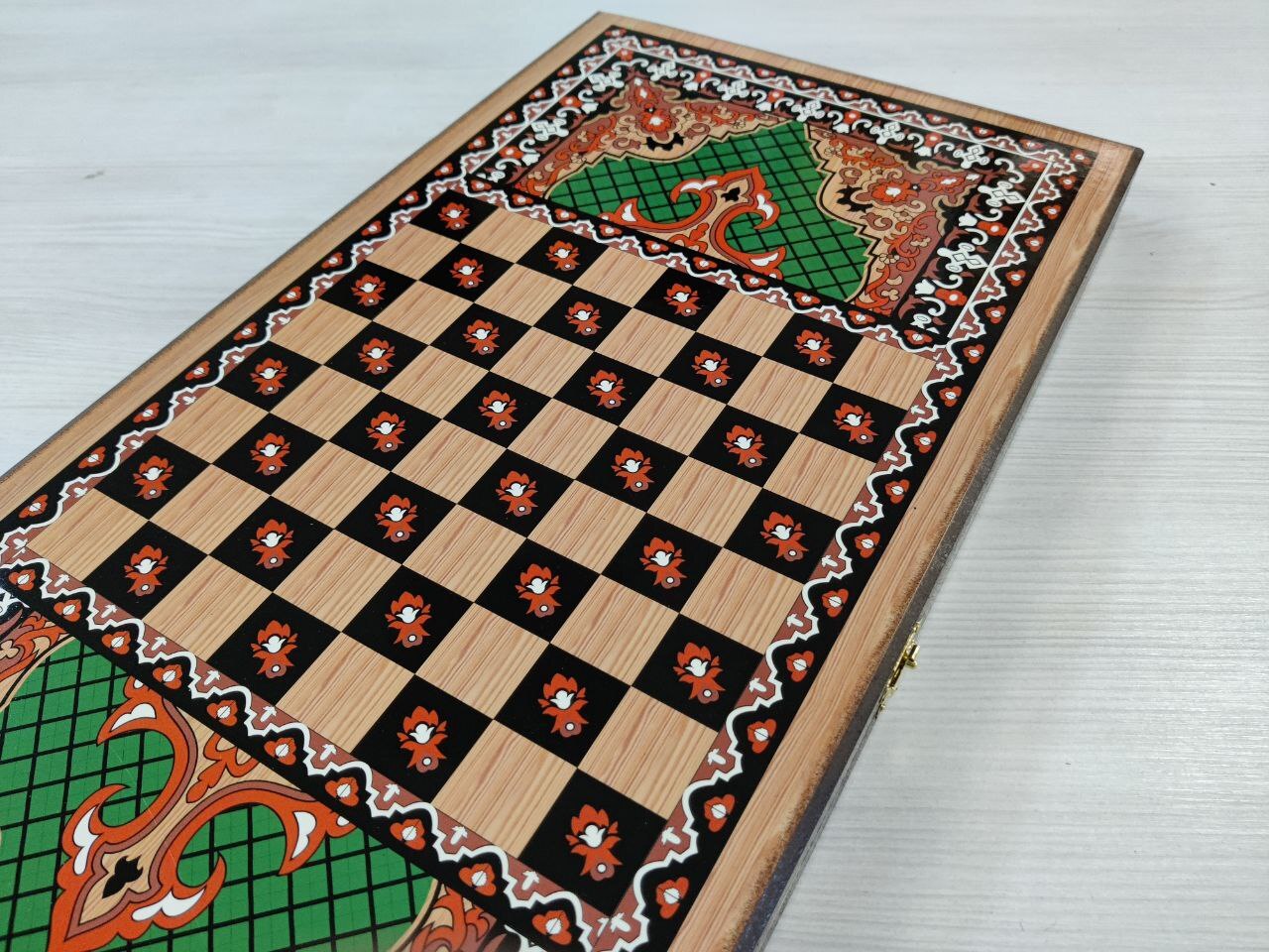 Нарды деревянные подарочные с цветным рисунком и полем для шашек Зеленый узор средние 50 см