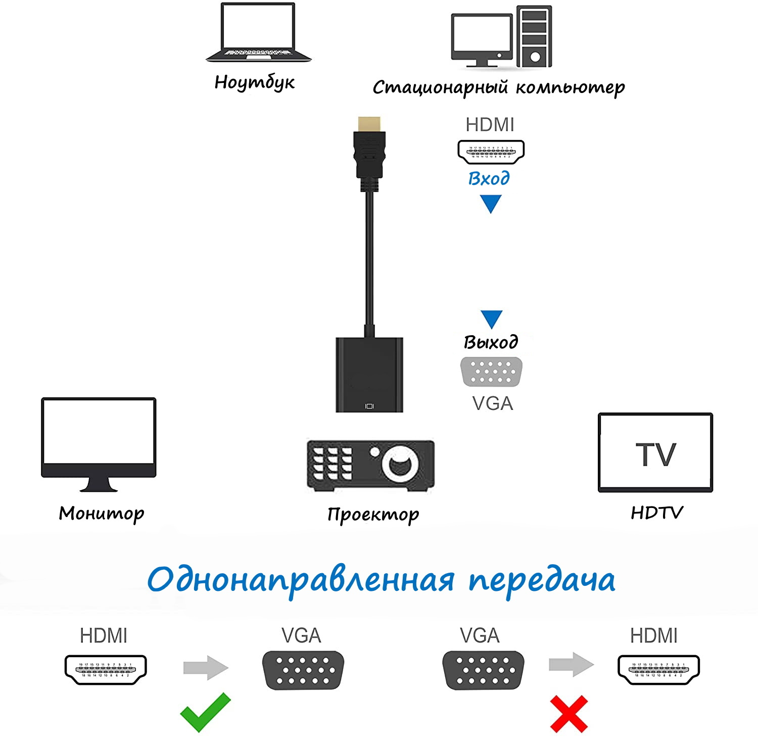 Адаптер переходник HDMI to VGA совместим ноутбуком, монитором, проектором, HDTV, Chromebook, Xbox