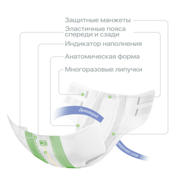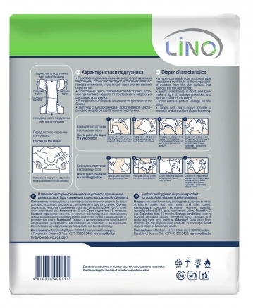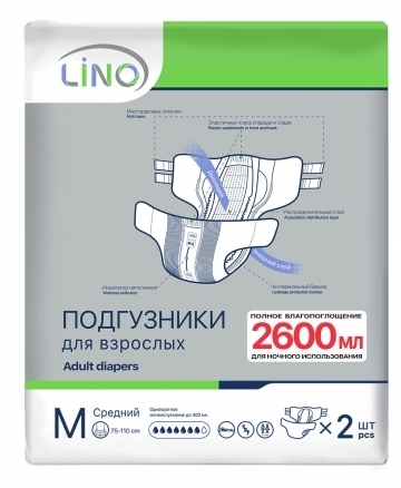 Подгузники для взрослых размер M (Medium) LINO в упаковке 2 шт, (полное влагопоглащение 2600 мл)