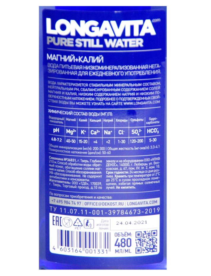 Вода Longavita питьевая негазированная (магний+калий), 0,48л